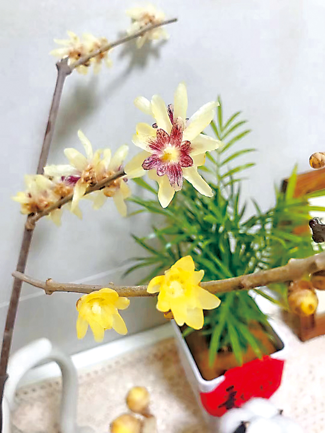 收到時都是含苞待放的花骨朵兒。兩天後,第一枝綻放了。未料所開之花並不是素心,而是內層呈紫色,外層淡黃色。詢問客服,答曰:「此為檀香蠟梅。蠟梅分素心、檀香、磬口等多個品種。」初始,心中頗有一絲不快,我下單的是素心蠟梅,為何卻送來不同品種?轉念一想,雖然店家搞錯,我卻因此得以了解蠟梅的不同品種,欣賞了它們不同的造型和香味,於我反而有所收穫。於是釋然,欣然拍下檀香和素心的合影。換點新品種的年宵花,學點新的植物知識,未嘗不是一種新的樂趣。