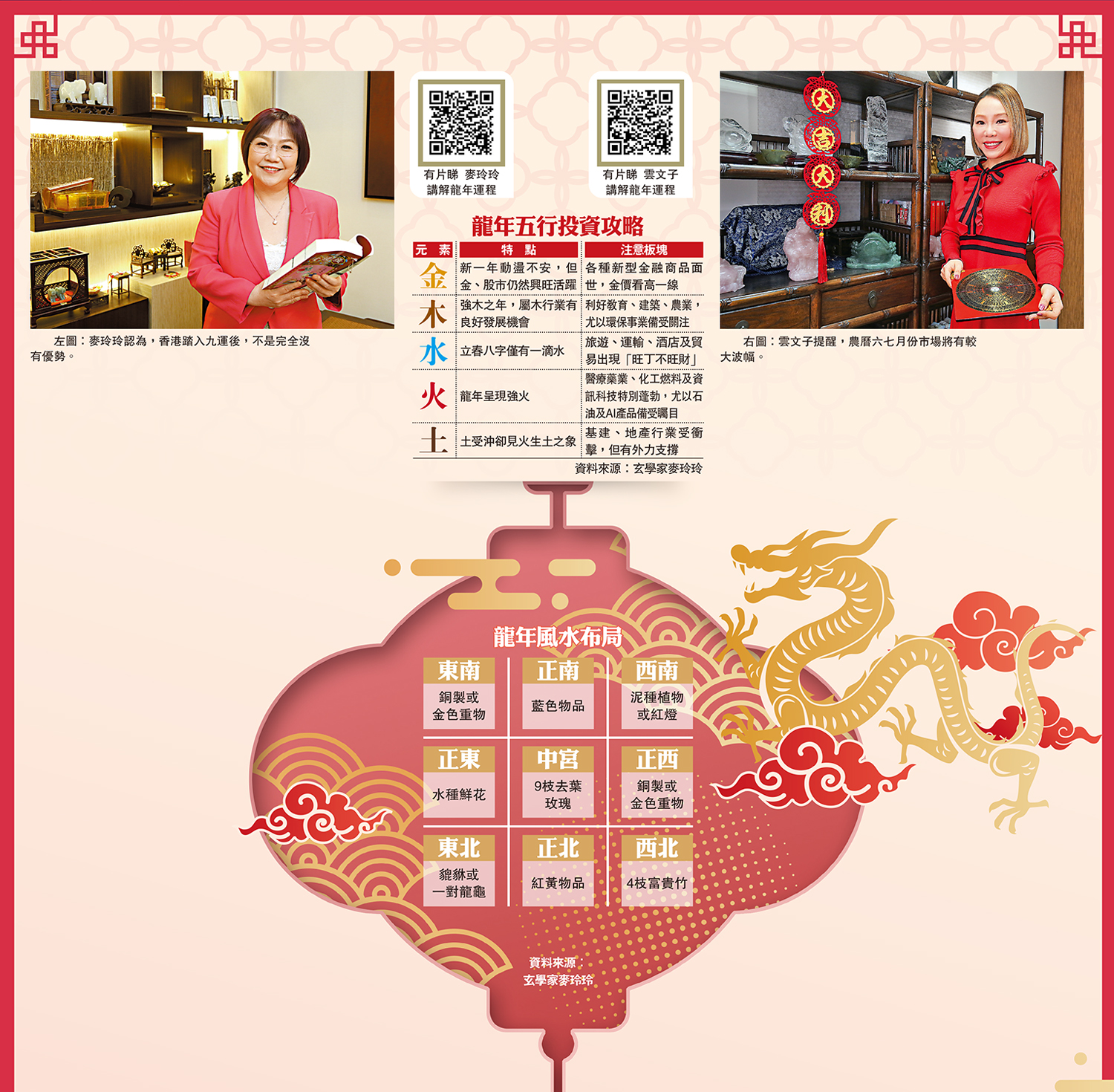 在五行方面,麥玲玲表示,甲辰龍年立春八字最強的是「金」,股市活躍,個別冷門行業會突圍而出。在強「木」之年,教育、環保亦有良好發展機會。辰龍年呈現強「火」,醫療藥業、新能源、化工等行業發展蓬勃,尤以石油及人工智能(AI)產品備受矚目,值得長線投資。