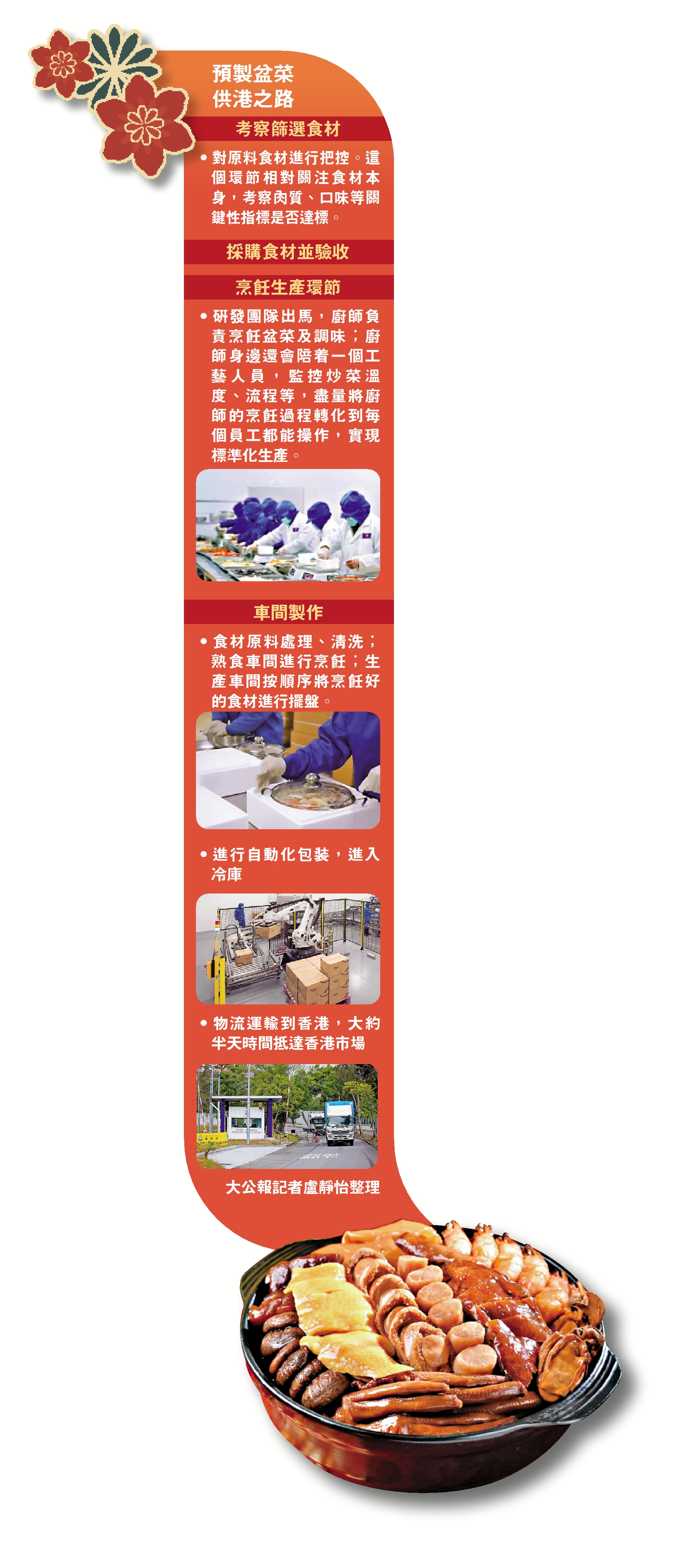 •研發團隊出馬,廚師負責烹飪盆菜及調味;廚師身邊還會陪着一個工藝人員,監控炒菜溫度、流程等,盡量將廚師的烹飪過程轉化到每個員工都能操作,實現標準化生產。