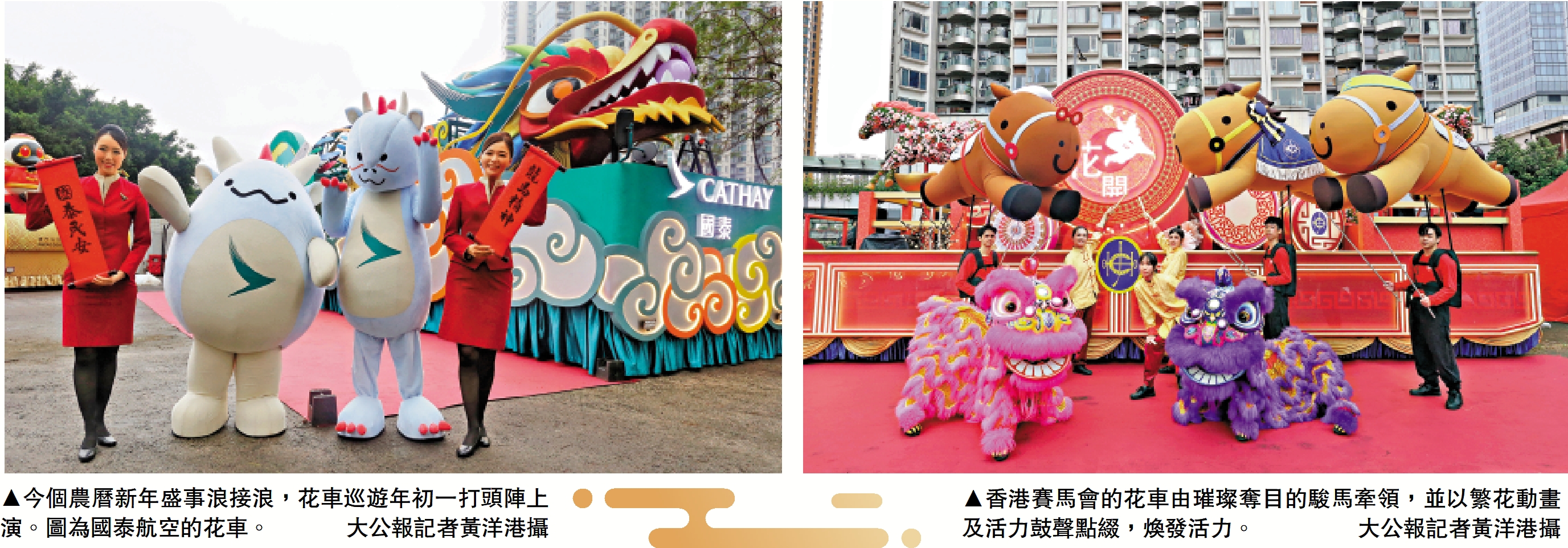 今個新春慶祝活動浪接浪,年初一響頭炮的是闊別五年復辦的花車巡遊,年初二有相隔四年再舉行的煙花匯演,年初三接力有農曆新年賽馬日,初四有世界足球明星於賀歲盃獻技。盛事遍布各區,為便利市民與訪港旅客在農曆新年期間四出遊玩,旅遊發展局推出一站式網頁,羅列主要旅遊景點、交通安排等資訊供查閱。