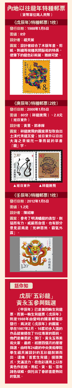 《甲辰年》已是第四輪生肖龍票,而第一輪生肖龍票《戊辰年》則是1988年由當時的國家郵電部發行。為決定《戊辰年》的圖案,早在1987年2月,16套初步入圍的作品就被擺在了15位專家的面前,他們是華君武、張仃、黃永玉等美術大家。最終,經歷四個月的層層篩選,由時年24歲的中央美術學院學生祖天麗設計的五彩龍脫穎而出。這條「首套生肖龍」揚頭舞爪,充滿活力,在色彩運用上以杏黃色作底襯,用紅、黃、藍、雪青諸色填鱗,烘托出了春節喜慶熱鬧的氣氛。