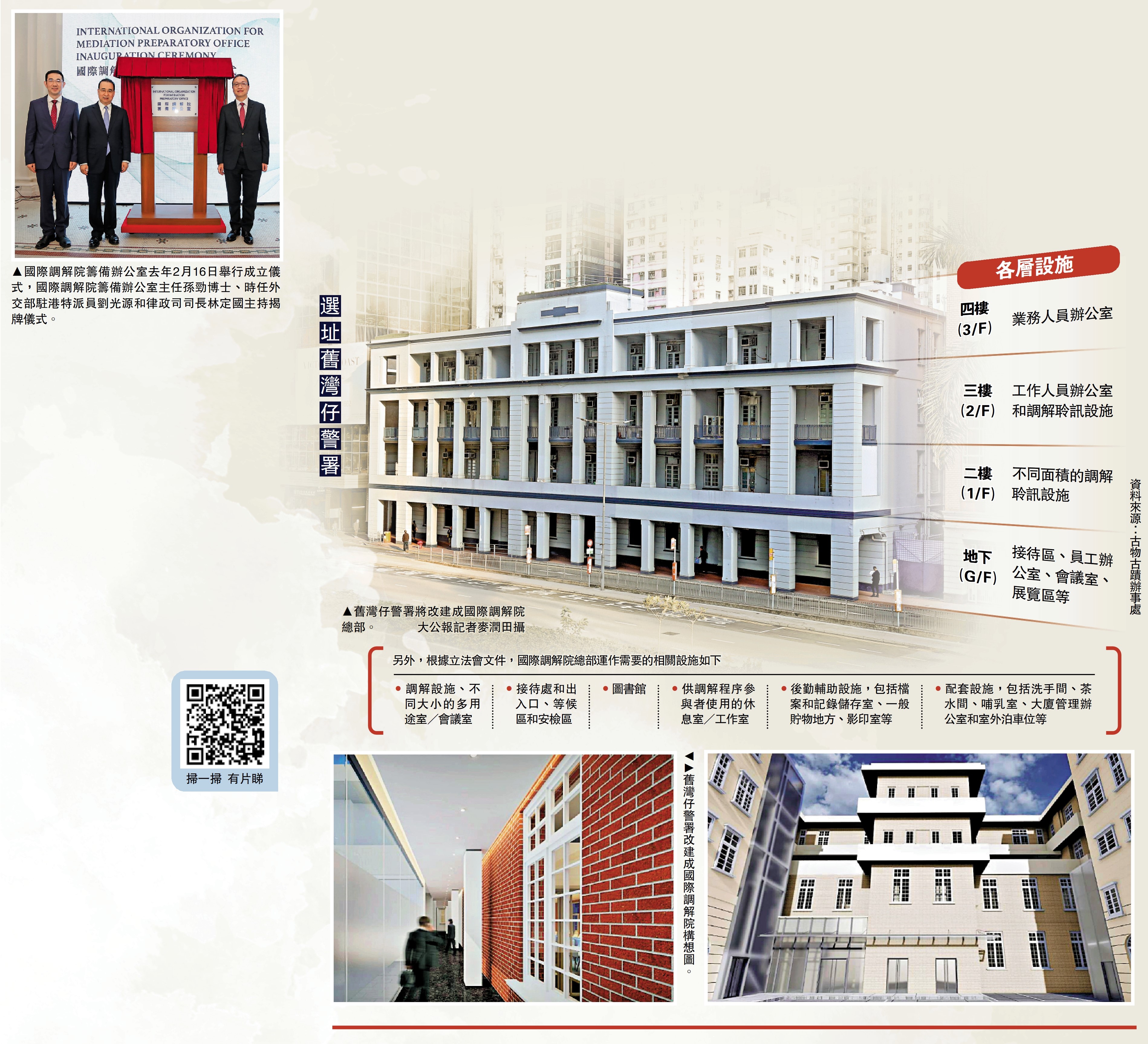 特區政府早前選定,把屬於二級歷史建築的舊灣仔警署,作為設立國際調解院總部的合適地點。參與《公約》磋商的各方已經協定,國際調解院總部的選址用地須於2025年年內就緒。