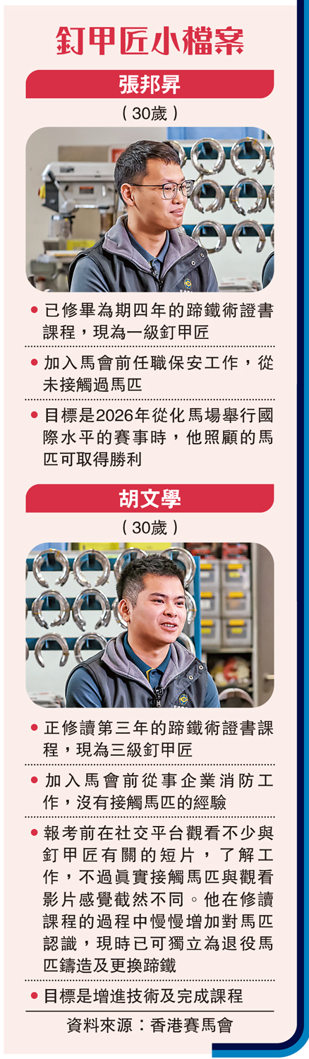 •報考前在社交平台觀看不少與釘甲匠有關的短片,了解工作,不過真實接觸馬匹與觀看影片感覺截然不同。他在修讀課程的過程中慢慢增加對馬匹認識,現時已可獨立為退役馬匹鑄造及更換蹄鐵