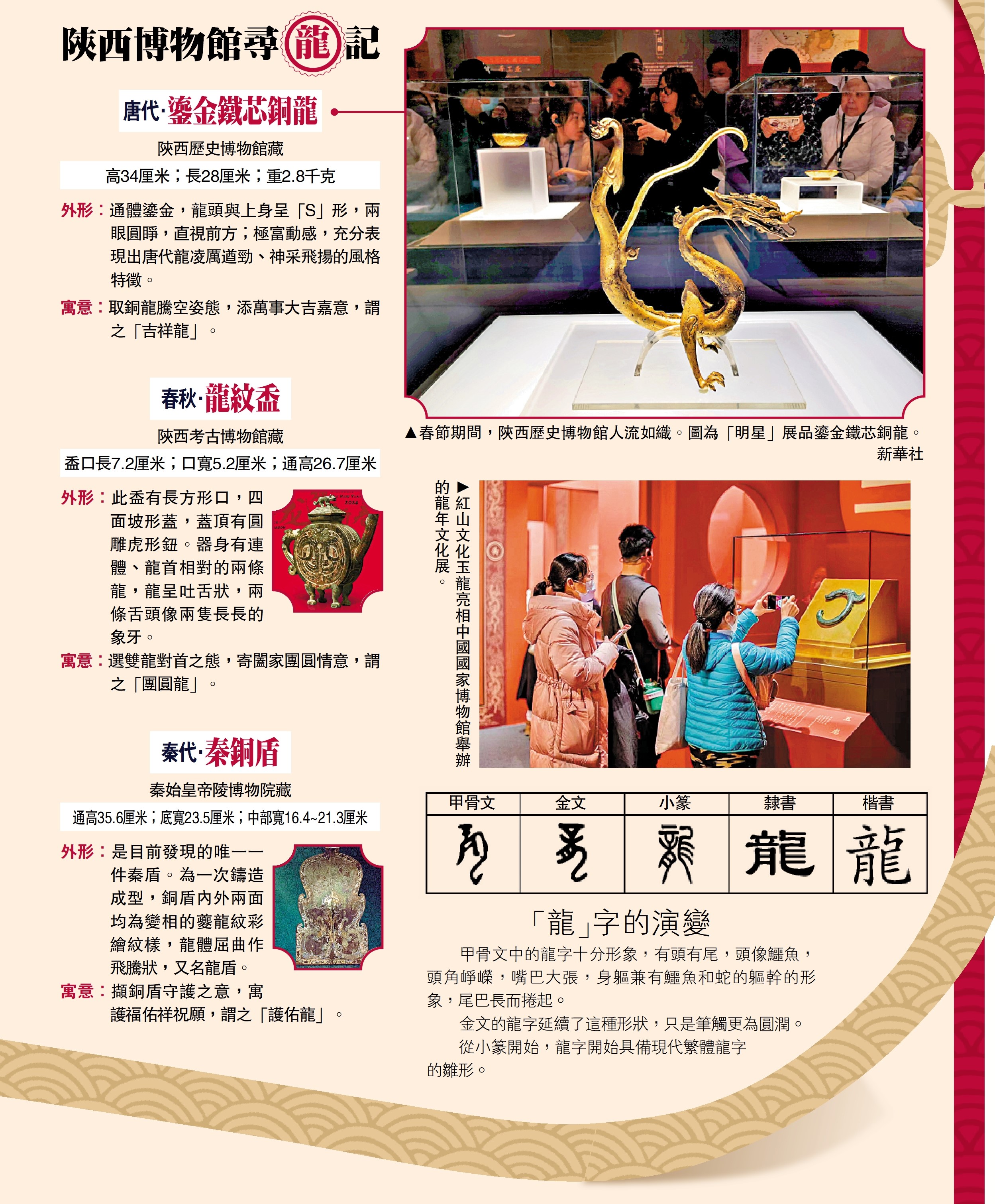 博物館裏過大年,身着新衣覓龍顏。「龍」是中華民族重要的精神象徵和文化符號,在很多文物中都有龍的形象。作為華夏文明的發源地之一,陝西擁有深厚的歷史底蘊和豐富的文化瑰寶。甲辰龍年,陝西歷史博物館、秦始皇帝陵博物院、陝西考古博物館、漢景帝陽陵博物院等九家大型文博機構,從眾多館藏珍寶中精選出來自周、秦、漢、唐四個朝代的九件祥龍文物,聯袂推出「尋龍賀新春」活動,希望通過尋找文物中的「中國龍」,帶領民眾透過歷史拾取文明的記憶,感受博大精深的中華文化。\大公報記者李陽波西安報道