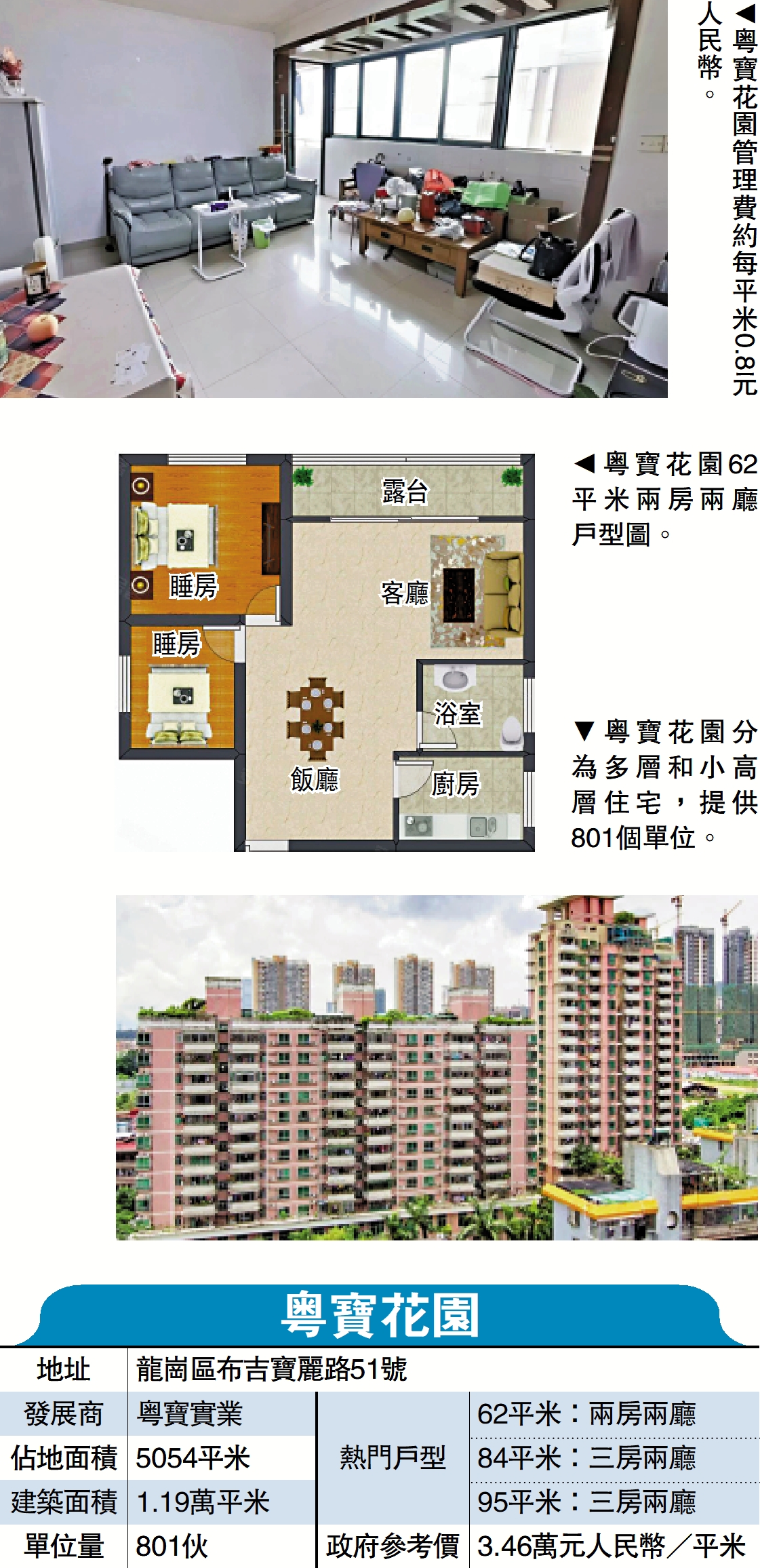 粵寶花園地處布吉寶麗路,毗鄰龍崗大道,分為東西兩區,於2000年入伙,共11幢,包括多層和小高層,共計801個單位,主力戶型包括62至73平米兩房和84至95平米三房,間隔方正。屋苑旺中帶靜,綠化率30%,政府參考價每平米3.46萬元(人民幣,下同)。管理費為每平米0.8元,是全深圳最便宜。
