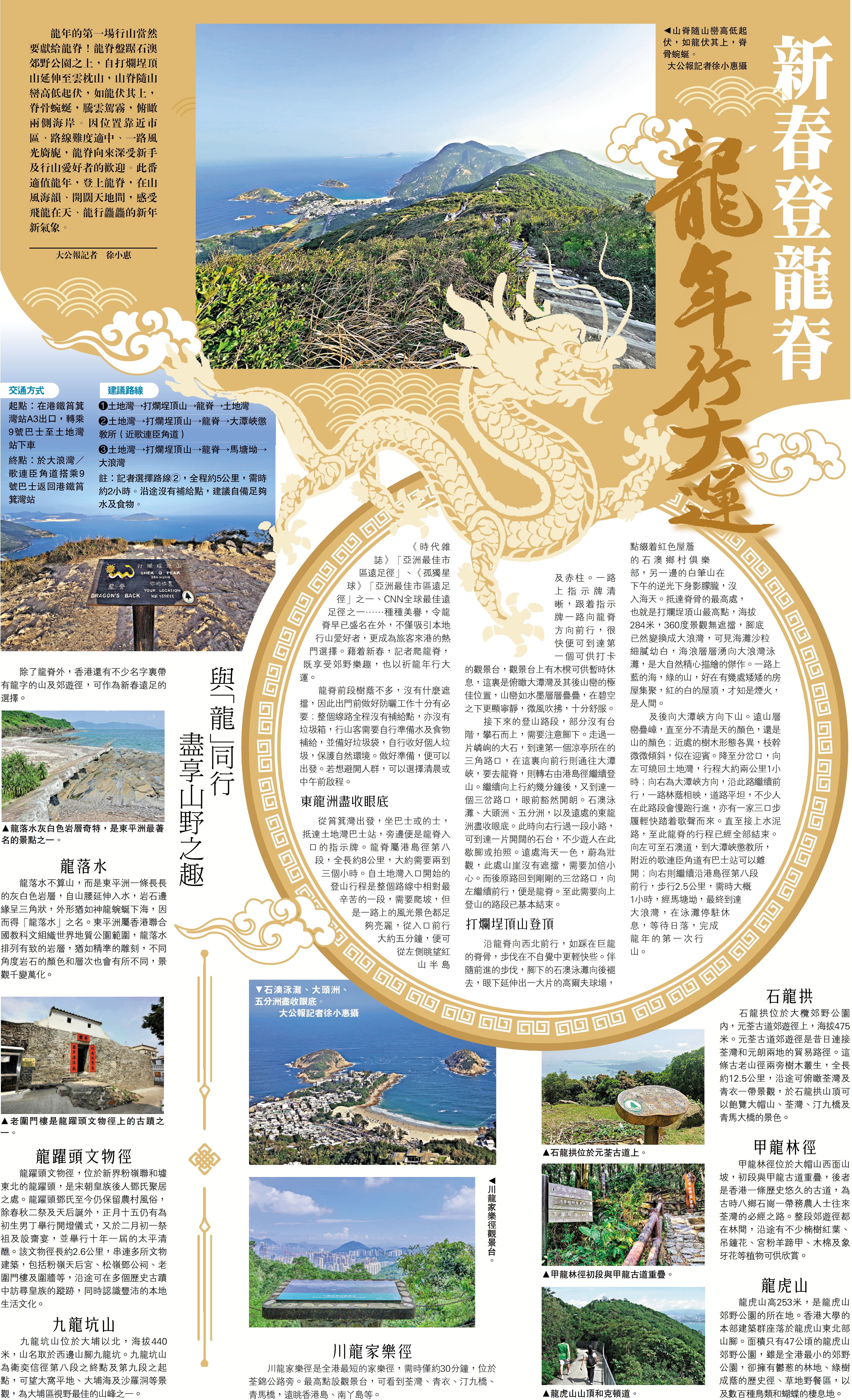 《時代雜誌》「亞洲最佳市區遠足徑」、《孤獨星球》「亞洲最佳市區遠足徑」之一、CNN全球最佳遠足徑之一……種種美譽,令龍脊早已盛名在外,不僅吸引本地行山愛好者,更成為旅客來港的熱門選擇。藉着新春,記者爬龍脊,既享受郊野樂趣,也以祈龍年行大運。