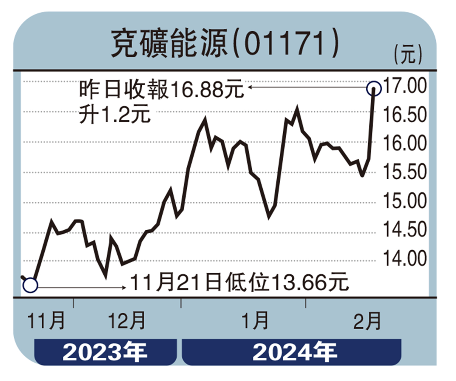再者,在中央支持中特估的概念下,兗礦能源現時市盈率只約3.7倍,屬極低水平,有利股價上升;加上息率達19%,屬同類股份中最高,故亦具高息股概念。股價今年以來在高位反覆上升,昨日在煤炭股受追捧下出現突破,創出一年新高,預期開展新升勢,可於現價買入,目標18元,跌破15.8元止蝕。該股昨日報16.88元,升7.56%。