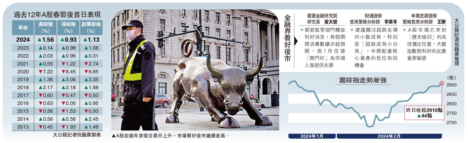 龍年首個交易日A股三大指數均錄「開門紅」。滬綜指升1.56%,收復2900點大關,報2910點;深成指、創業板指分別升0.93%和1.13%。昨日有逾4200隻個股上升,超200隻股票漲停。分析稱,此前A股因「流動性坍塌」帶來的風險已基本解除,經濟基本面、政策面、交易層面,以及外圍市場中國資產表現等,均對A股節後上漲提供支撐,目前A股已具備更高的配置價值。\大公報記者 倪巍晨