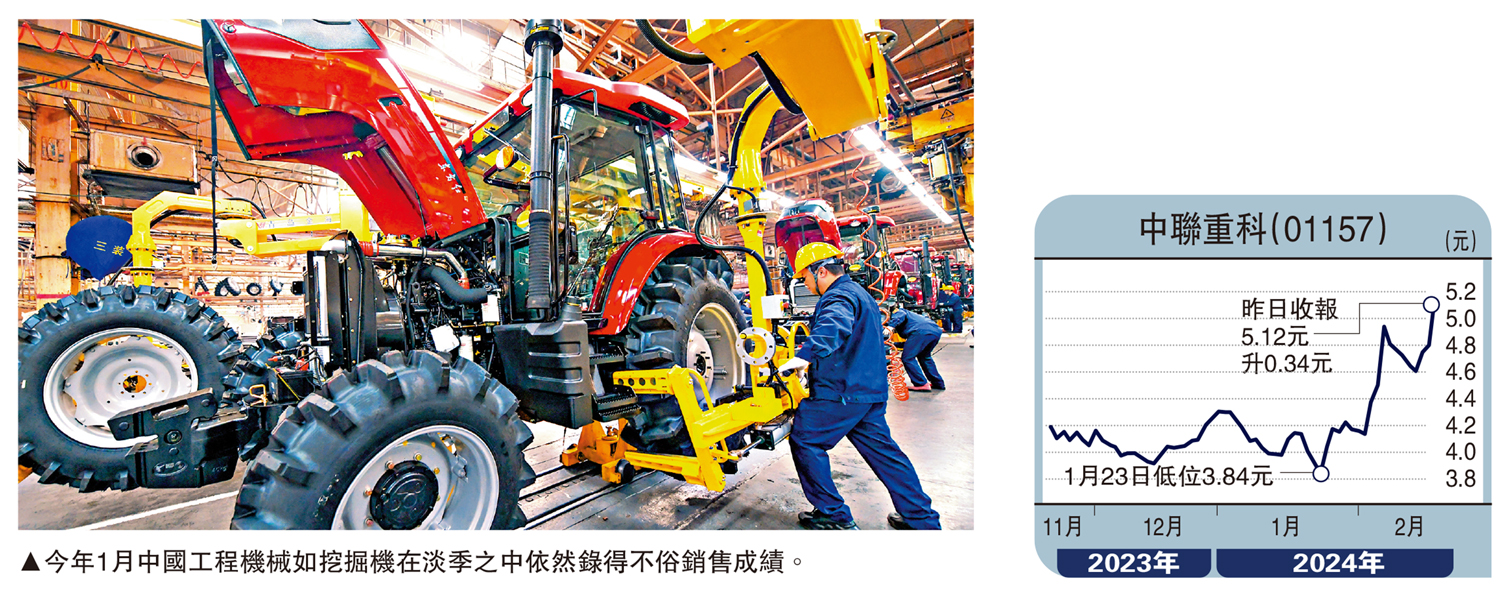 此外,今年1月中國工程機械如挖掘機在淡季之中依然錄得不俗銷售成績,同比增長18.5%至1.2萬多台,是連續12個月同比下跌之後首次轉正增長,刺激中聯重科(01157)股價單日勁升7%,這顯示內地基建等投資項目陸續上馬,展現出中國經濟活力與動力正在加強。