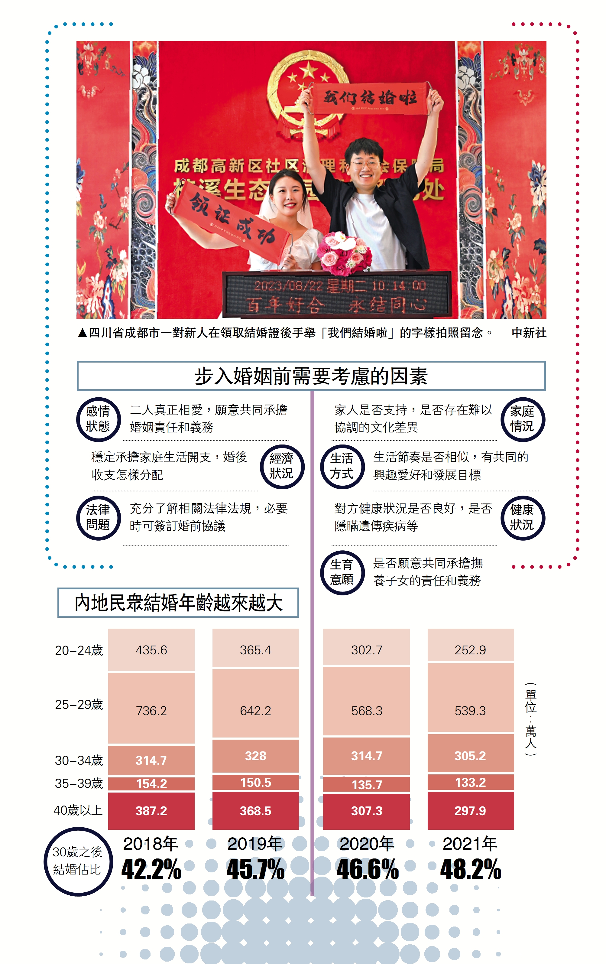 剛剛過去的甲辰龍年春節,「每逢佳節被催婚」也再度成為內地單身青年的「難關」,不僅「80、90後」被花式催婚,就連剛到法定婚齡的「00後」也未能幸免。與家長們的熱切關注形成鮮明對照的是,部分青年人對婚姻表現出奇「冷靜」,甚至在網上細數自己「不想結婚的理由」,認為與婚姻生活相比,自由無拘束的單身生活顯然更具吸引力。但也有不少年輕人對婚姻組建新家庭充滿期待,並且希望婚姻美滿的同時,也能孕育新生命。對於當代內地年輕人而言,「結婚」究竟是「必經路」,還是「選擇題」?/大公報記者 任芳頡、郭瀚林 實習記者 李暢
