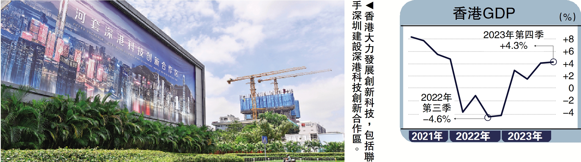 然而,香港在國家強大後盾的支持下,去年經濟走出疫情低谷,在2023年重現3.2%正增長,成功逆轉2022年收縮3.7%的低迷狀況。值得留意的是,去年第四季香港經濟預先估計為按年增長4.3%,比第三季4.1%為高,去年第四季環比增幅亦較第三季加快0.2個百分點至0.5%,顯示香港經濟保持增長動能,為今年延續復甦勢頭奠下重要基礎。
