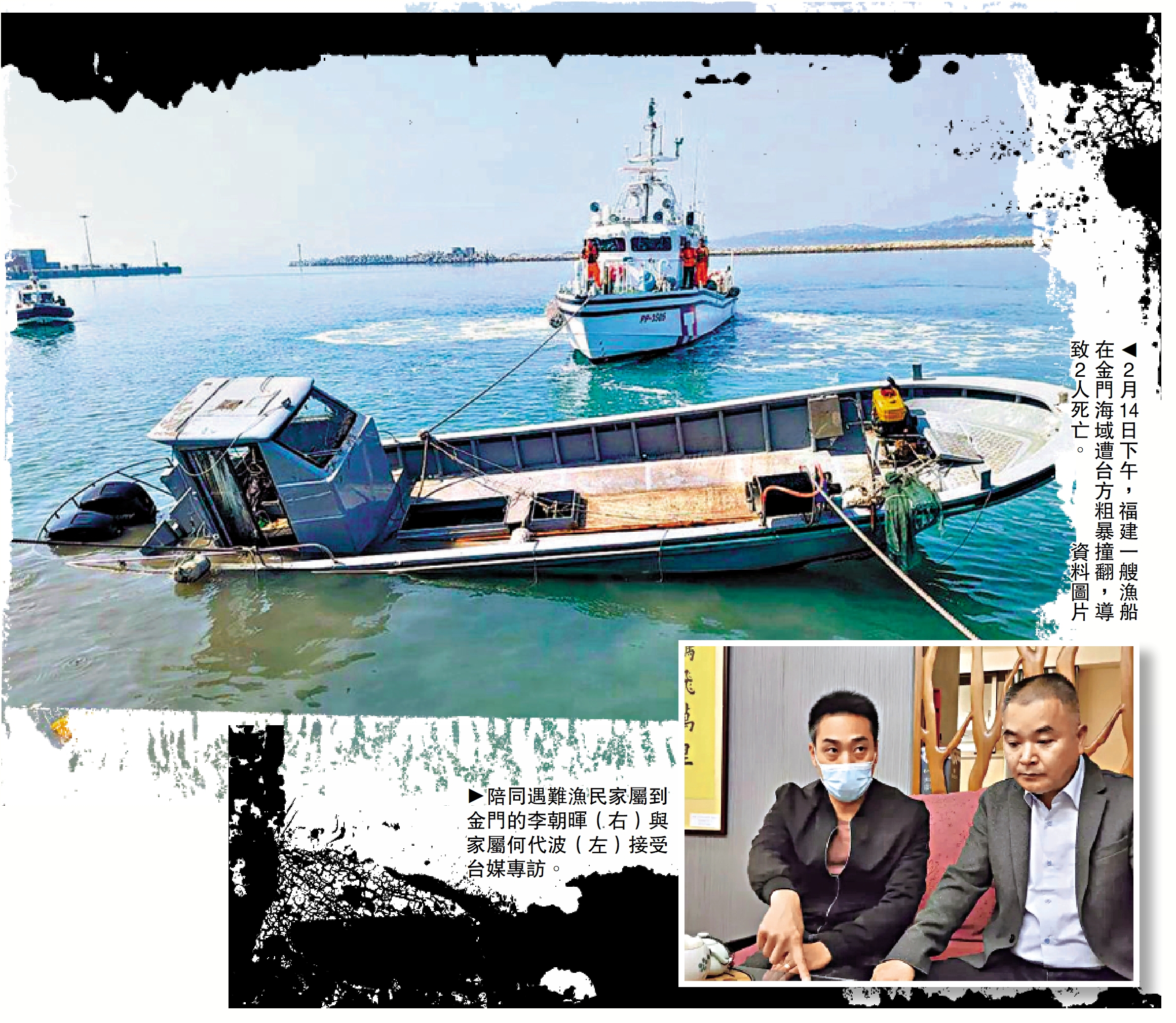 台方2月14日粗暴對待大陸漁船致2名漁民遇難事件發生後,正在金門的遇難者家屬接受台灣《聯合報》專訪,批評台海巡艇撞翻大陸漁船,海巡部門說辭前後不一。陪同家屬赴金門的福建泉州晉江紅十字會高級顧問李朝暉也說,只要提到要求查明真相,台海巡部門就推諉撒謊、百般阻撓。23日,國民黨籍「立委」徐巧芯公布一份海巡內部人員提供的報告,其中時間順序與「海巡署」記者會所提供的說法有出入,消失的時間多達30分鐘。她質疑「海巡署」高層居心何在?為何要隱匿過程?必須說明清楚。