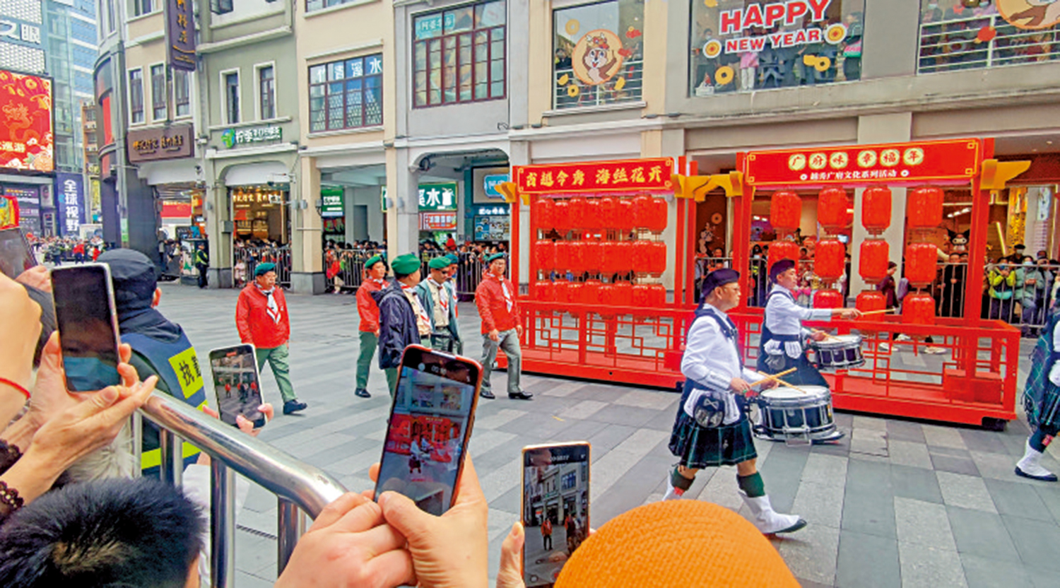 在巡遊隊伍中,肇慶非遺舞蹈《五馬巡城》、國家級非遺項目「芷溪花燈」、番禺沙灣飄色等傳統文化元素紛紛亮相。更為引人注目的是來自香港的童軍樂隊,為整個巡遊活動增添了一抹別樣的色彩。香港童軍總會秀茂坪區會務委員林志波表示,已經連續參加了7年的巡遊,每次都能感受到廣州對傳統文化傳承的濃厚氛圍。