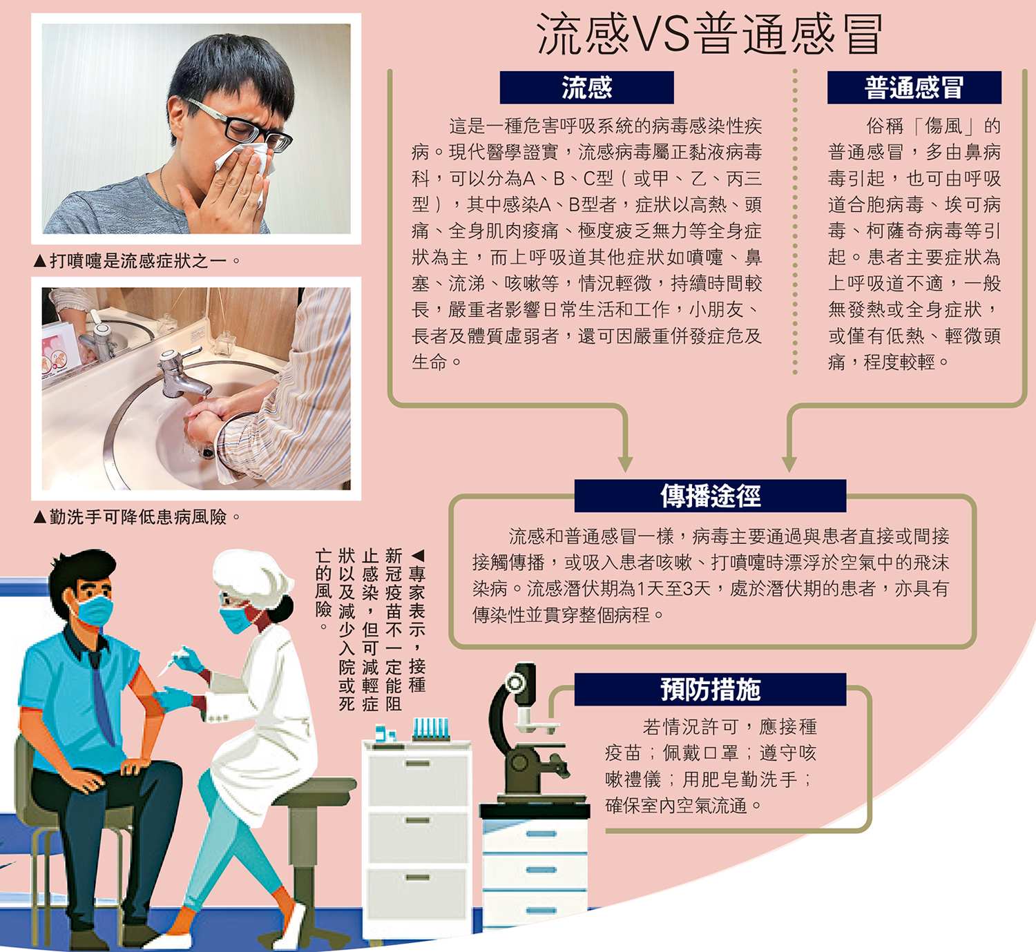 這是一種危害呼吸系統的病毒感染性疾病。現代醫學證實,流感病毒屬正黏液病毒科,可以分為A、B、C型(或甲、乙、丙三型),其中感染A、B型者,症狀以高熱、頭痛、全身肌肉痠痛、極度疲乏無力等全身症狀為主,而上呼吸道其他症狀如噴嚏、鼻塞、流涕、咳嗽等,情況輕微,持續時間較長,嚴重者影響日常生活和工作,小朋友、長者及體質虛弱者,還可因嚴重併發症危及生命。