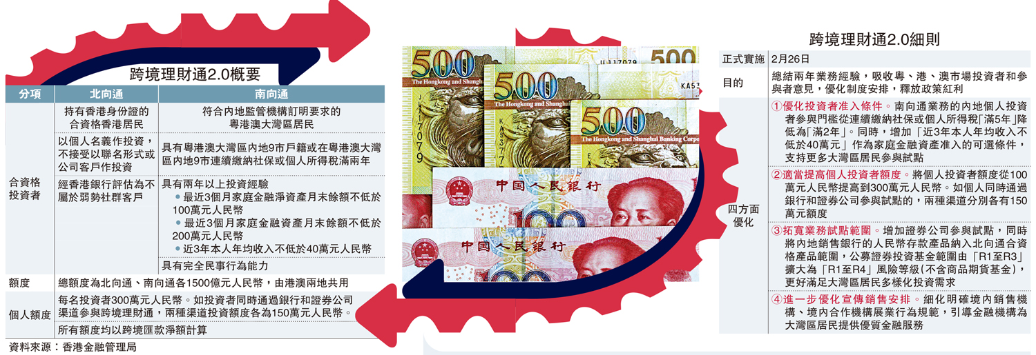 跨境理財通2.0昨日正式啟動,新框架優化投資者的准入條件,並將投資者的個人投資額度由100萬元(人民幣,下同)提高至300萬元。有調查反映,新措施有助吸引更多投資者入市或追加投資,超過兩成受訪者將在未來一年內投資100萬元以上。銀行業對理財通的優化紛紛表示支持,並進一步拓寬提供的產品種類及數量。\大公報記者 劉 遠
