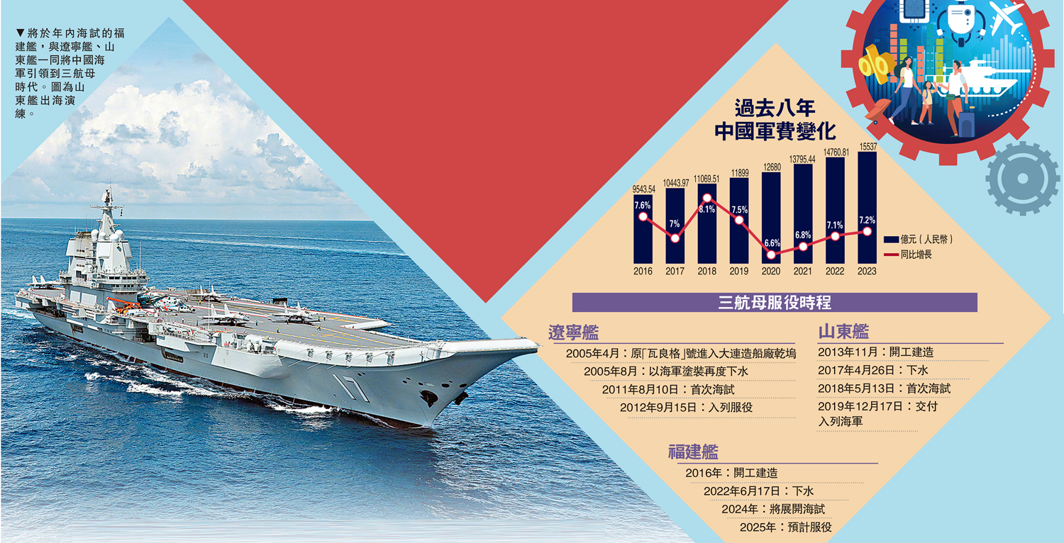 面對壓力挑戰,中國海軍以「下餃子」速度加速強勁重器的打造。福建艦自2022年6月下水後,2023年10月三條彈射軌道亮相,11月即開始進行配重車彈射測試。今年1月和2月,殲-15T等比例模型機已登上福建艦,距離正式海試更近一步。