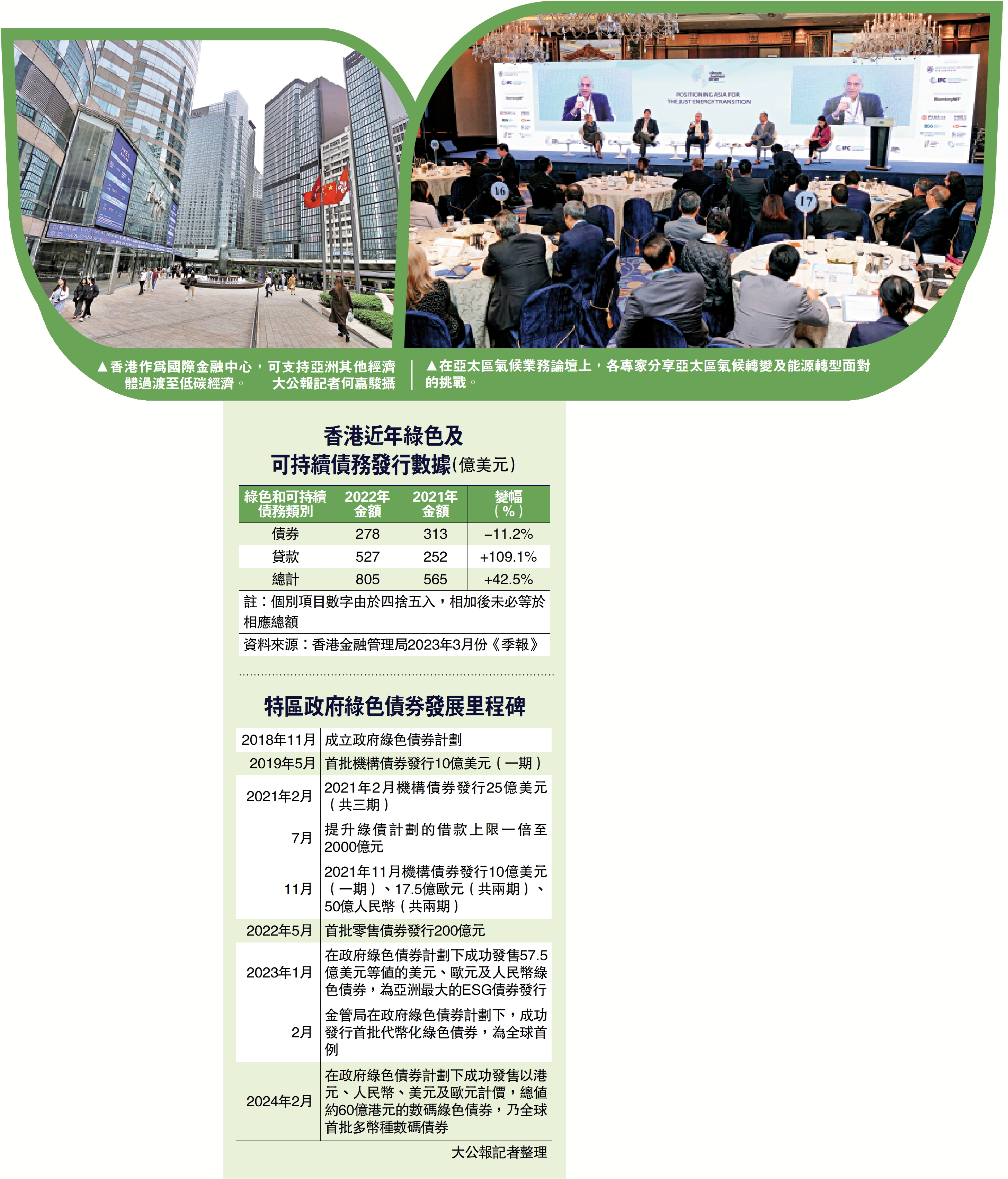 在各方持續努力之下,香港在可持續金融方面也取得成績。余偉文介紹說,在2022年,亞洲地區超過三分之一的綠色和可持續債券和貸款是在香港安排,反映香港在可持續金融領域的地位日益重要。香港每年發行的綠色和可持續債務(債券及貸款)也在過去幾年取得顯著增長,於2022年增長至800多億美元。