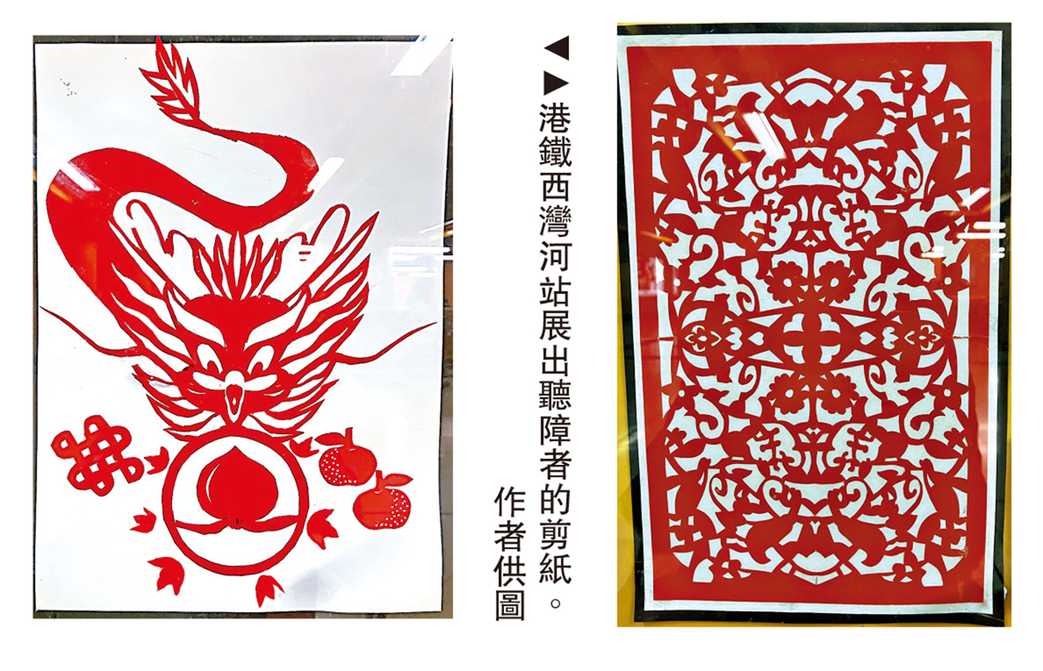 自動電梯把我載到出閘那層,正要離開西灣河港鐵站,卻遠遠瞧見剪紙陳列牆上櫃內,中國紅分外搶眼,玻璃透出喜氣,便趨前觀看。一看,眼睛發亮,一陣驚喜,暖上心頭,原來是聽障者的作品。右下角有介紹,他們在二○一九年成立剪紙藝社。有相同的愛好,且匯聚一起,觀摩切磋,在剪紙天地裏學習有年,如今量與質都成熟得可舉辦小型展覽,這裏頭隱隱浮動着自強不息的力量。