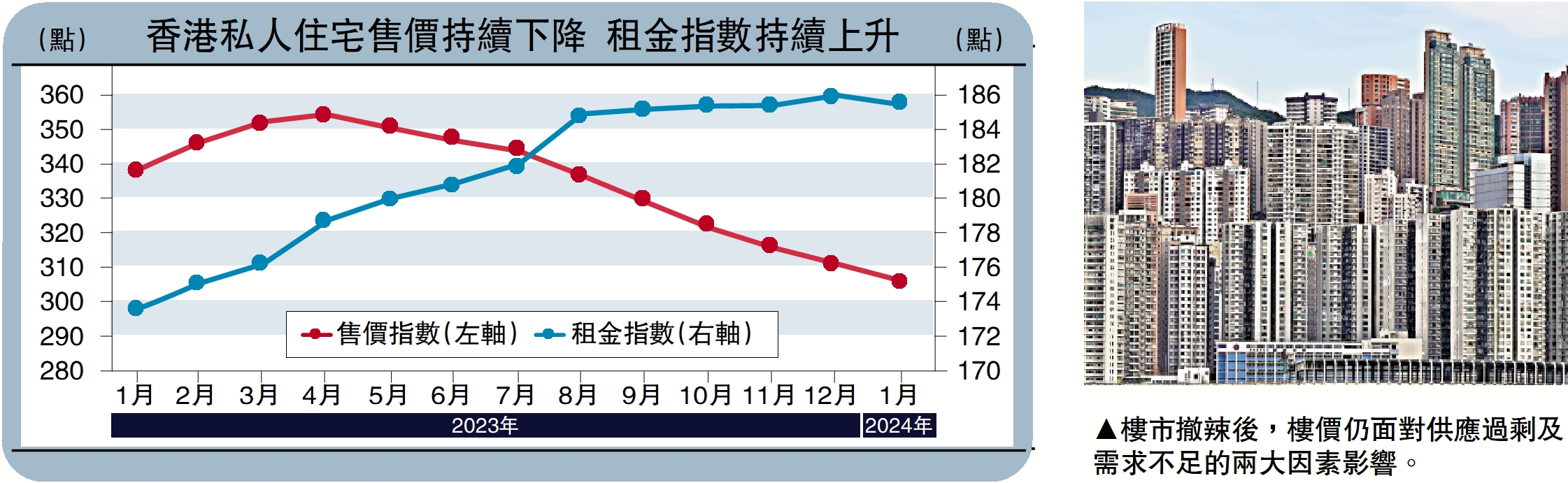 開年以來,樓市數據未有改觀。香港差餉物業估價署最新統計顯示,2024年1月份私人住宅售價指數為306.4點,環比下跌約1.6%,為連續九個月下跌,累計下挫約13%,創2016年10月以來新低。與2021年9月的歷史高位398.1點相比,下跌約23%。