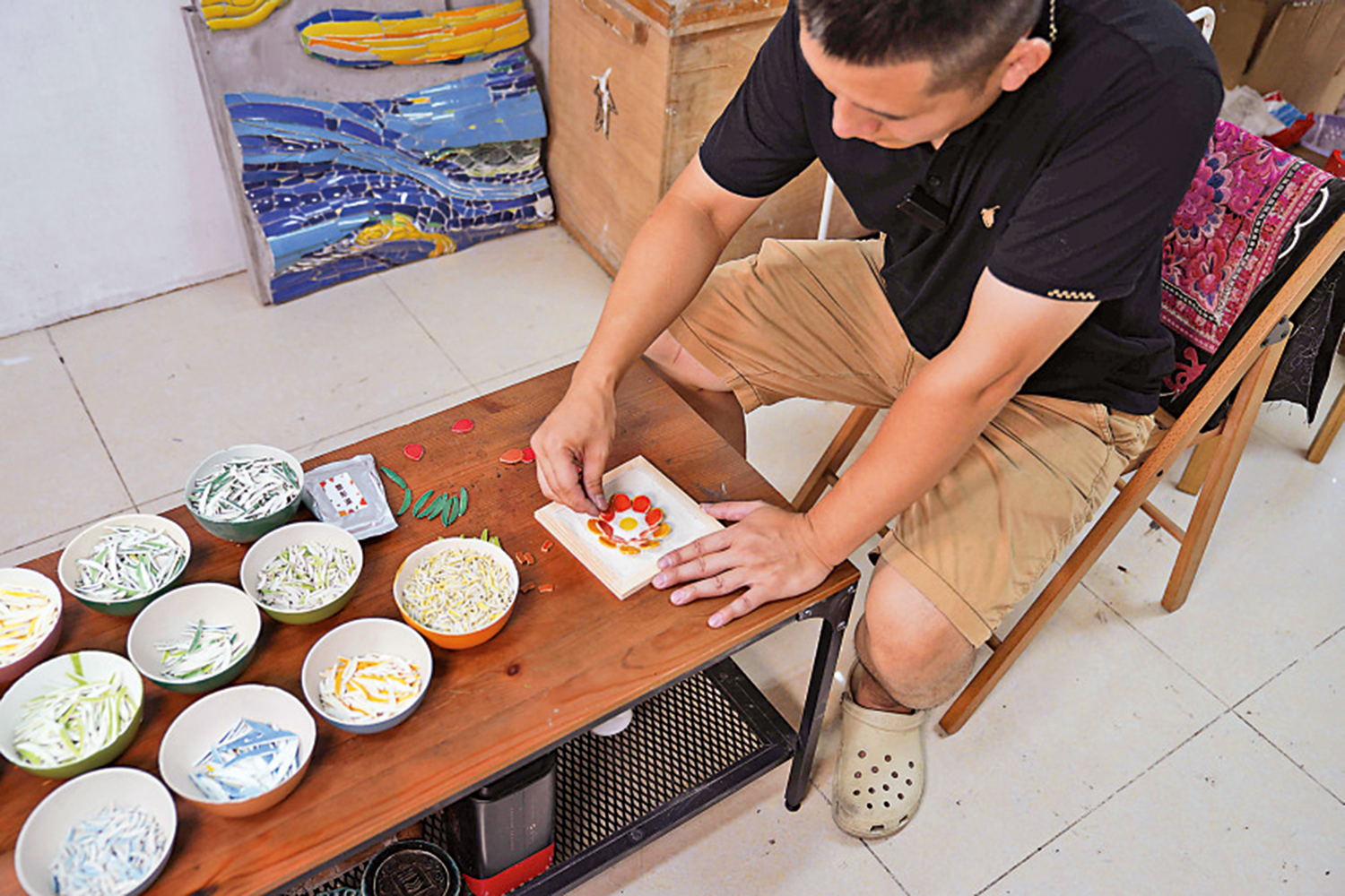 此外,陳旭南也思考如何讓更多人接觸嵌瓷這門傳統藝術。他設計出一套名為「生如夏花」的嵌瓷材料包,可以讓孩子們自行發揮,用瓷片創作出不同花色、肌理的作品。同時,陳旭南還回到學校的壁畫課堂上,給學生們講授這門傳統手工藝。