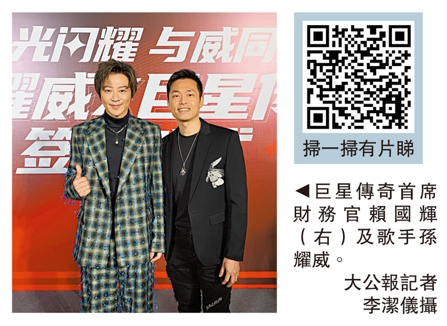 巨星傳奇旗下天賦星球日前與歌手孫耀威簽署合作協議,雙方協定未來將音樂創作、明星IP授權及內容打造等開啟合作。賴國輝指出,集團致力開發不同IP,包括首批簽約的藝人,未來將繼續擴大範圍。他續說,巨星傳奇並非單純的經紀公司,更希望實現藝人的創新想法、發揮專長。