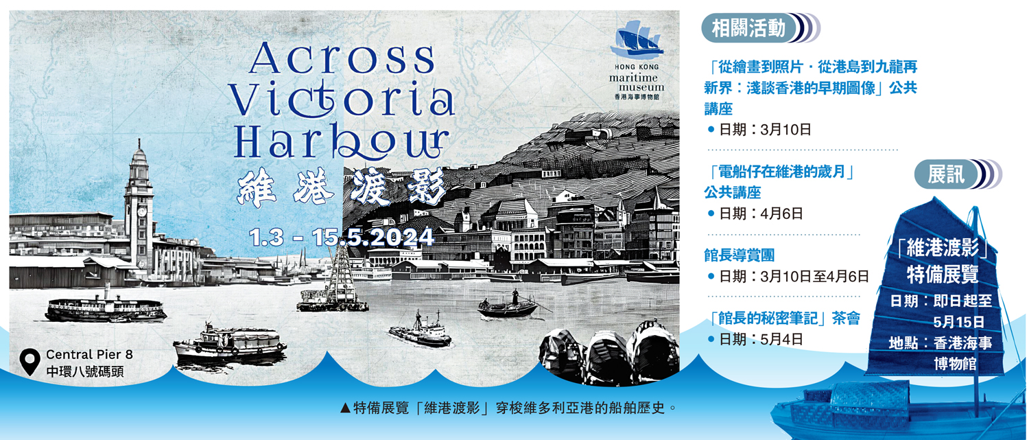 19世紀末,香港商業活動和人口的增長,促進了海上交通工具的興起(如渡輪和電船),與此同時,隨着開埠,香港物流業需求改變,貨船也在大小、結構和功能上不斷變化。展現香港自1842年至今港口發展、船舶變化的特備展覽「維港渡影」,於即日起至5月15日在香港海事博物館舉行。展覽深入穿梭維多利亞港的船舶歷史,包括客船如舢舨、渡輪、電船,及貨船如駁艇、拖輪和躉船,展示維多利亞港的獨特故事。通過一系列的香港舊照片、畫作、歷史文件和船模型,以及一個按照真實尺寸重建的舊電船售票亭及「嘩啦嘩啦之旅」遊戲,帶領參觀者一同回到過去,體驗往日乘搭電船的過程。\大公報記者 徐小惠