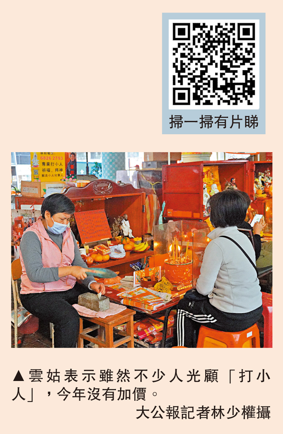 銅鑼灣鵝頸橋底昨日人頭湧湧,鞋拍打聲此起彼落。雲姑在鵝頸橋幫人「打小人」已經6年,她說,今年的收費和去年一樣,每位50元。由於昨日是好日,故雖未到正日,亦吸引不少人光顧。只見雲姑一手拿着女裝鞋,一手拿着小人紙,着客人寫上小人的名字後,就認真地打了起來。她口中念念有詞,「打你個小人頭,打到你成世冇出頭……」之後將寫有名字的小人紙包裹在老虎樣式的紙裏,用肥豬油抹一下老虎的嘴,寓意老虎吃飽了就走了。最後擲聖杯,一陰一陽便完事了。
