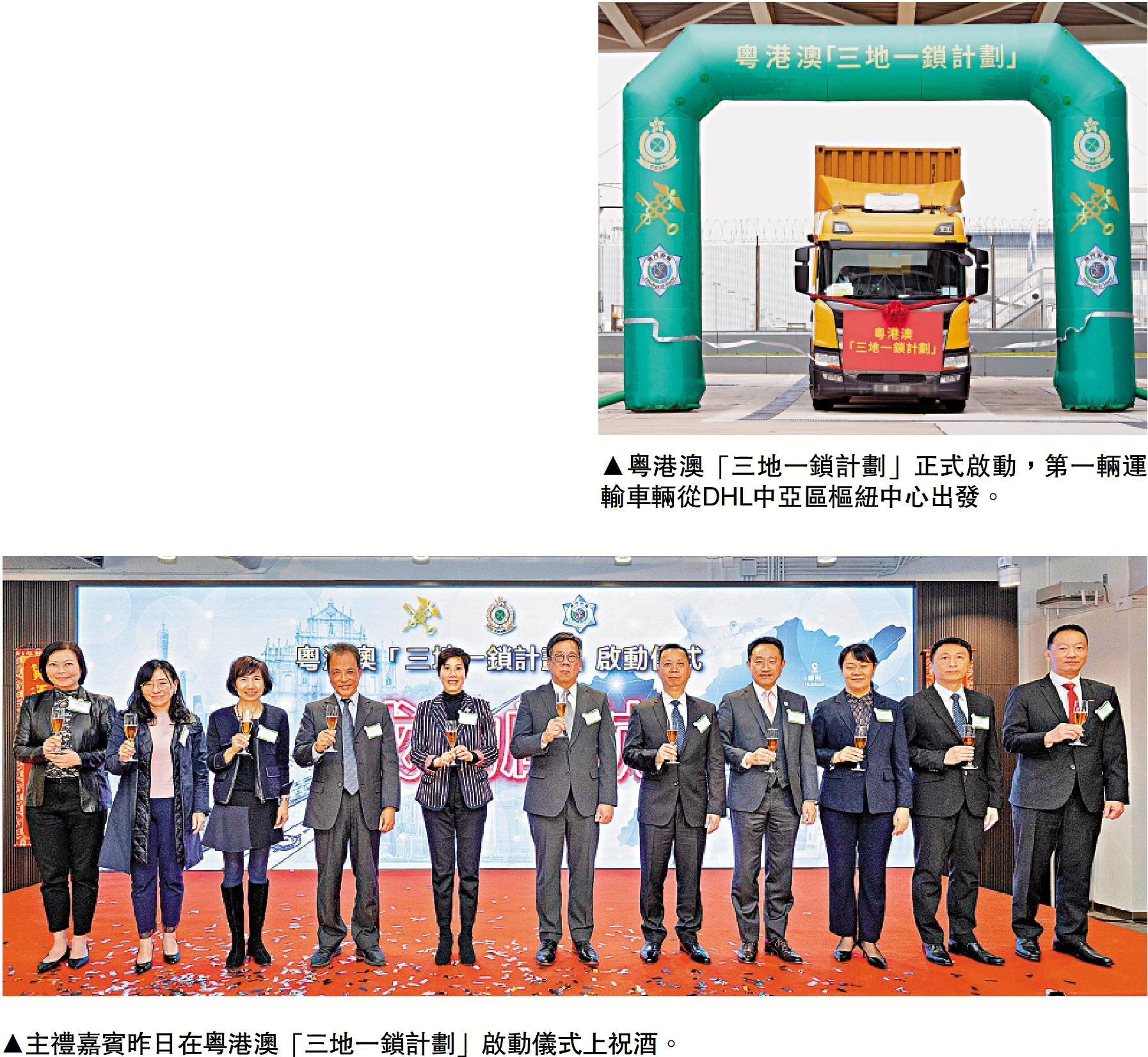 粵港澳「三地一鎖計劃」昨日正式啟動,商務及經濟發展局局長丘應樺、海關關長何珮珊、澳門海關關長黃文忠和國家海關總署廣東分署副主任馮國清昨日在DHL中亞區樞紐中心主持啟動儀式。首批貨物同日由樞紐中心經港珠澳大橋及大橋澳門口岸側新興建的跨境貨物轉運站,順利運抵澳門的清關點。