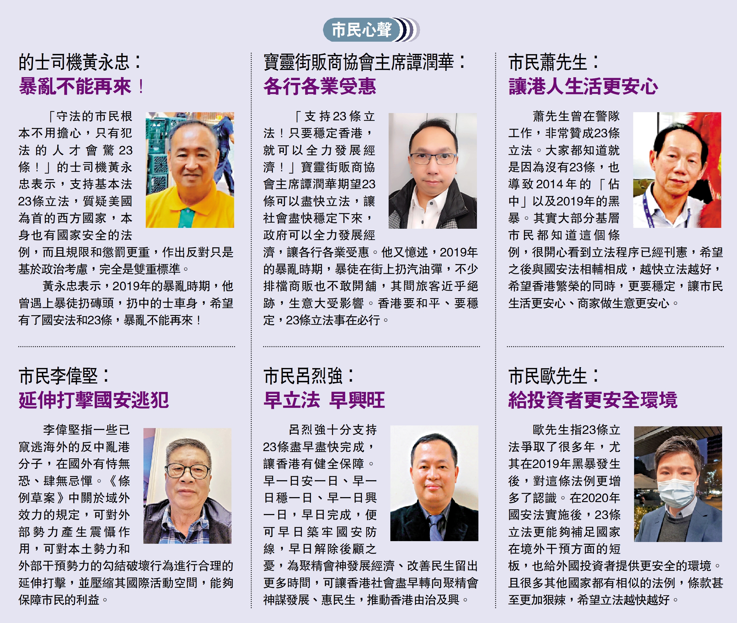 「守法的市民根本不用擔心,只有犯法的人才會驚23條!」的士司機黃永忠表示,支持基本法23條立法,質疑美國為首的西方國家,本身也有國家安全的法例,而且規限和懲罰更重,作出反對只是基於政治考慮,完全是雙重標準。
