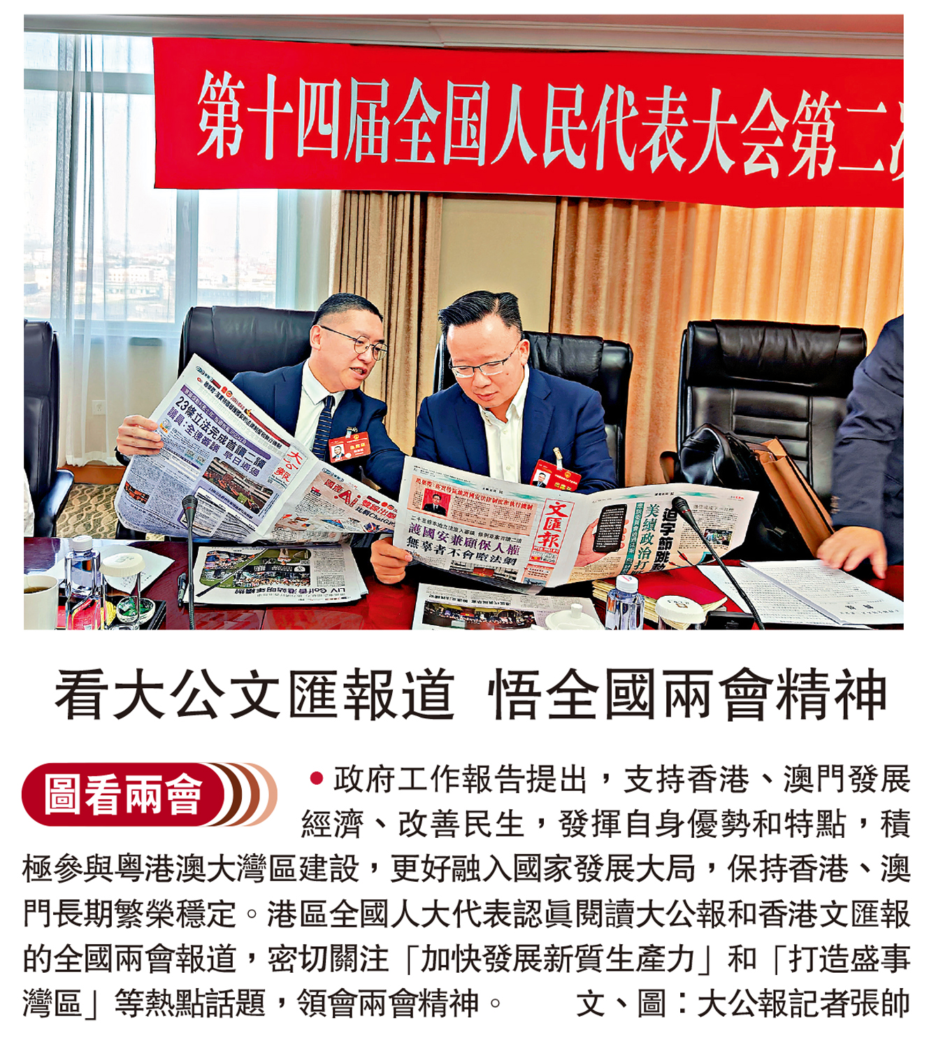 •政府工作報告提出,支持香港、澳門發展經濟、改善民生,發揮自身優勢和特點,積極參與粵港澳大灣區建設,更好融入國家發展大局,保持香港、澳門長期繁榮穩定。港區全國人大代表認真閱讀大公報和香港文匯報的全國兩會報道,密切關注「加快發展新質生產力」和「打造盛事灣區」等熱點話題,領會兩會精神。\文、圖:大公報記者張帥