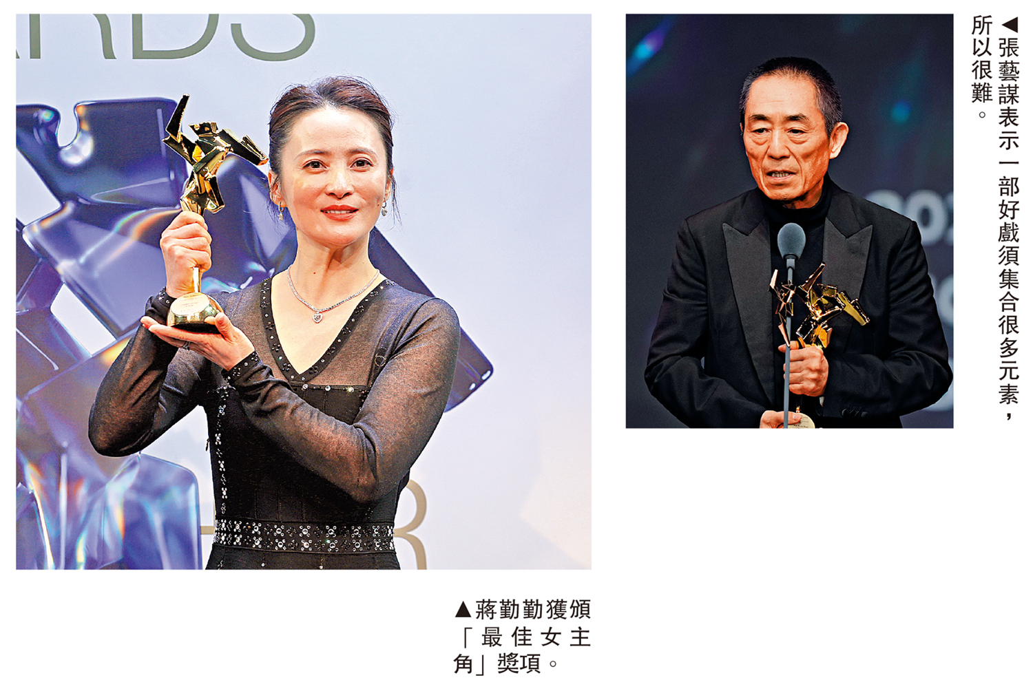 年度盛事、第17屆亞洲電影大獎頒獎典禮昨晚在西九戲曲中心舉行,來自亞洲各地電影人齊聚,星光熠熠。「最佳男主角」競爭激烈,結果日本資深男星役所廣司憑《新活日常》擊敗《金手指》梁朝偉奪得,中國內地女星蔣勤勤憑《草木人間》膺「最佳女主角」。中國導演張藝謀獲頒終身成就獎,其執導的電影《滿江紅》則獲「2023年最高票房亞洲電影」。\大公報記者 溫穎芝(文) 黃洋港(圖)