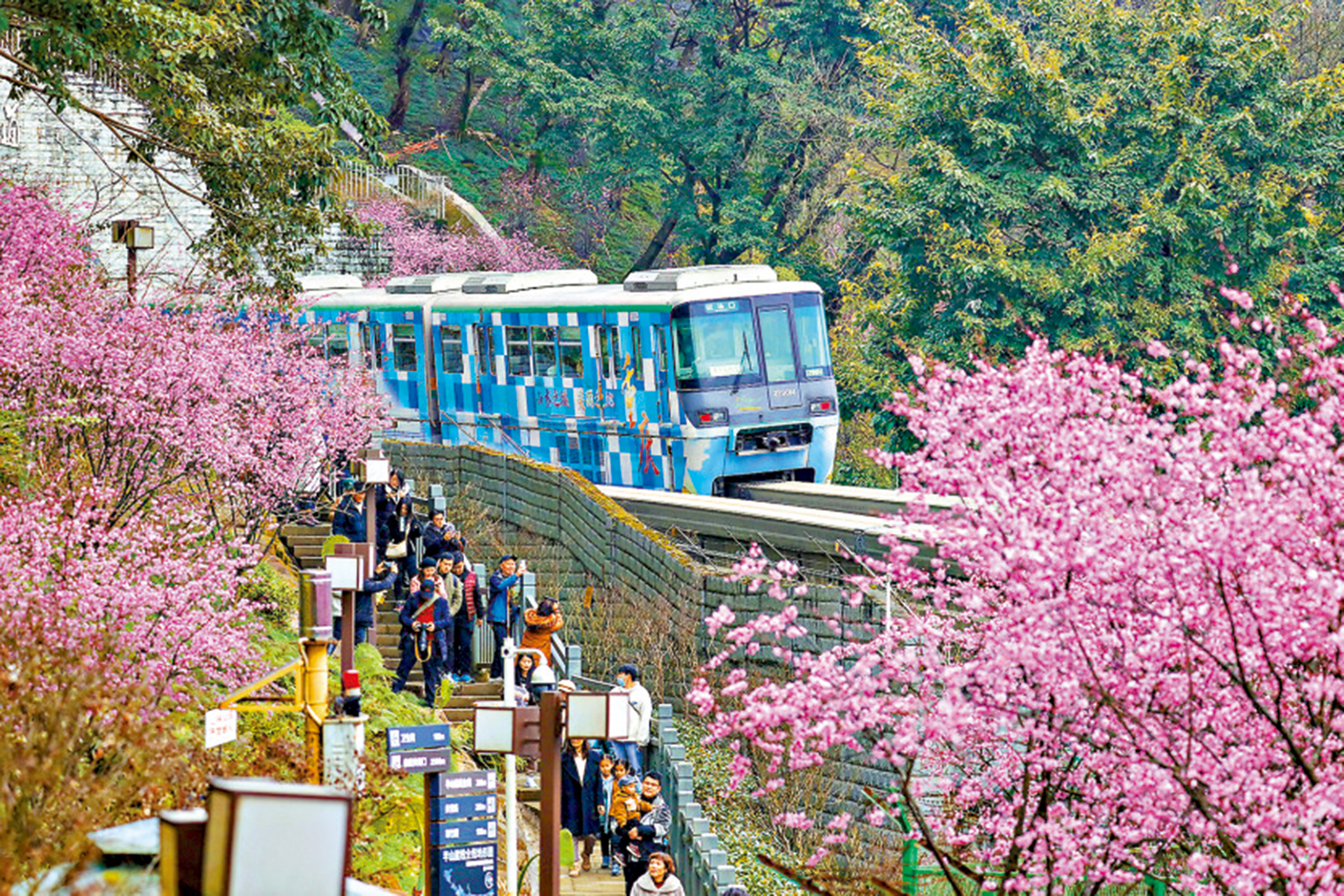 進入3月以來,重慶各色花卉不約而同進入盛花期。重慶軌道交通2號線單軌列車在佛圖關段粉色花海中呼嘯而過,被網友形象地稱為「開往春天的列車」。