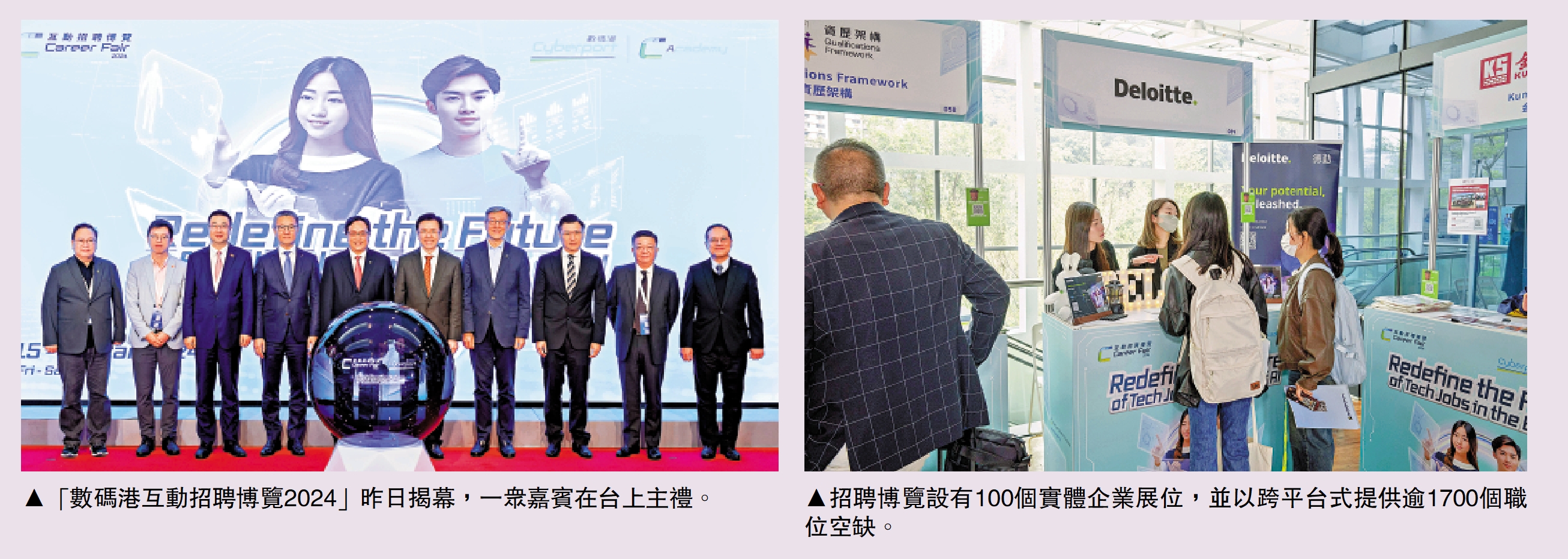 「數碼港互動招聘博覽2024」昨日揭幕,博覽設有100個實體企業展位,提供超過1700個職位空缺,當中包括AI、Web3領域職位。此外亦有多個政府部門及公營機構參加,包括香港警務處、政府資訊科技總監辦公室等。