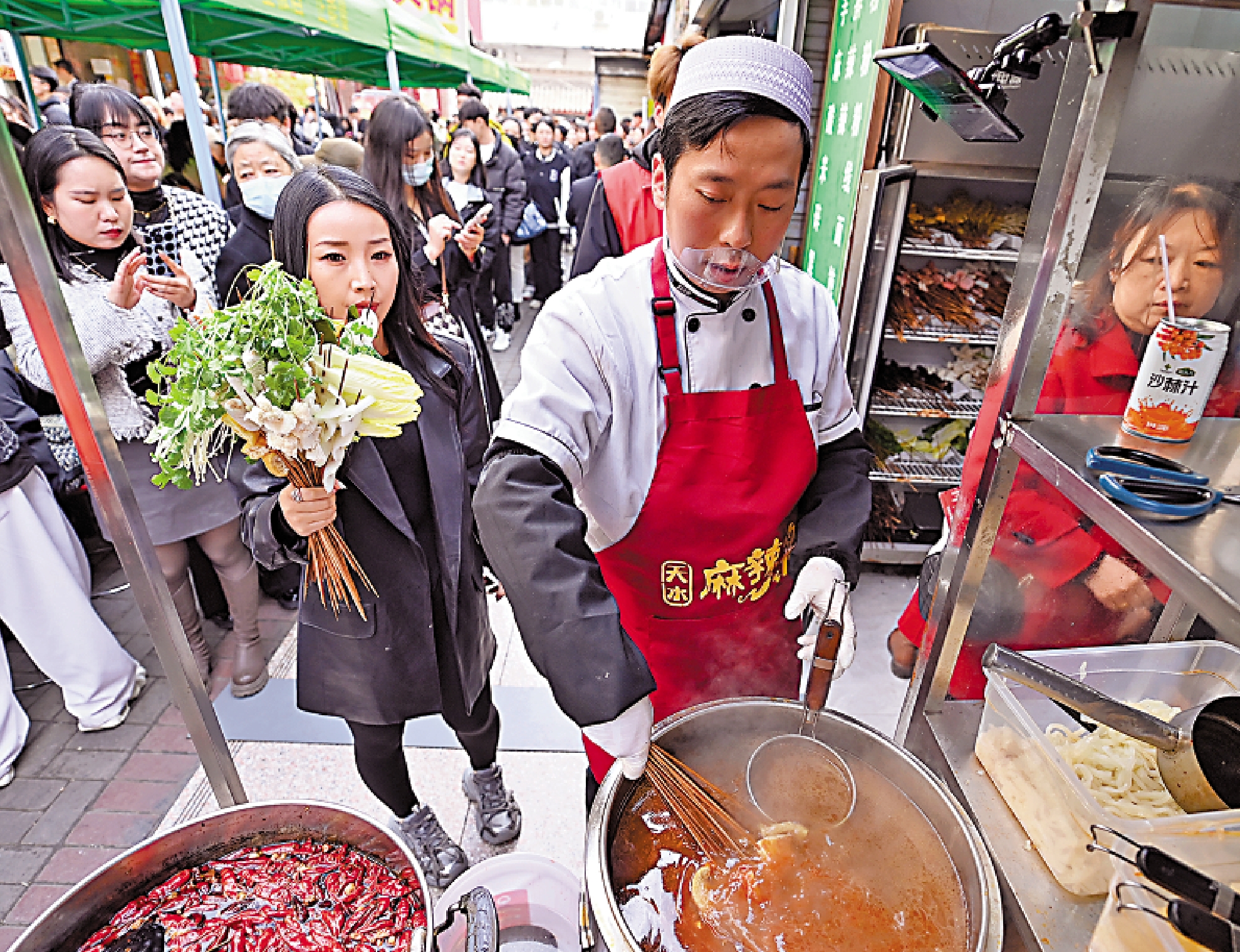 「麻辣燙+手擀粉」的熱辣CP也是一大特點。店家用土豆澱粉和麵、切條現製而成,極致的綿軟爽滑。作為甘肅飲食的「頂樑柱」,洋芋片、洋芋丸子,也是碗裏必不可少的。
