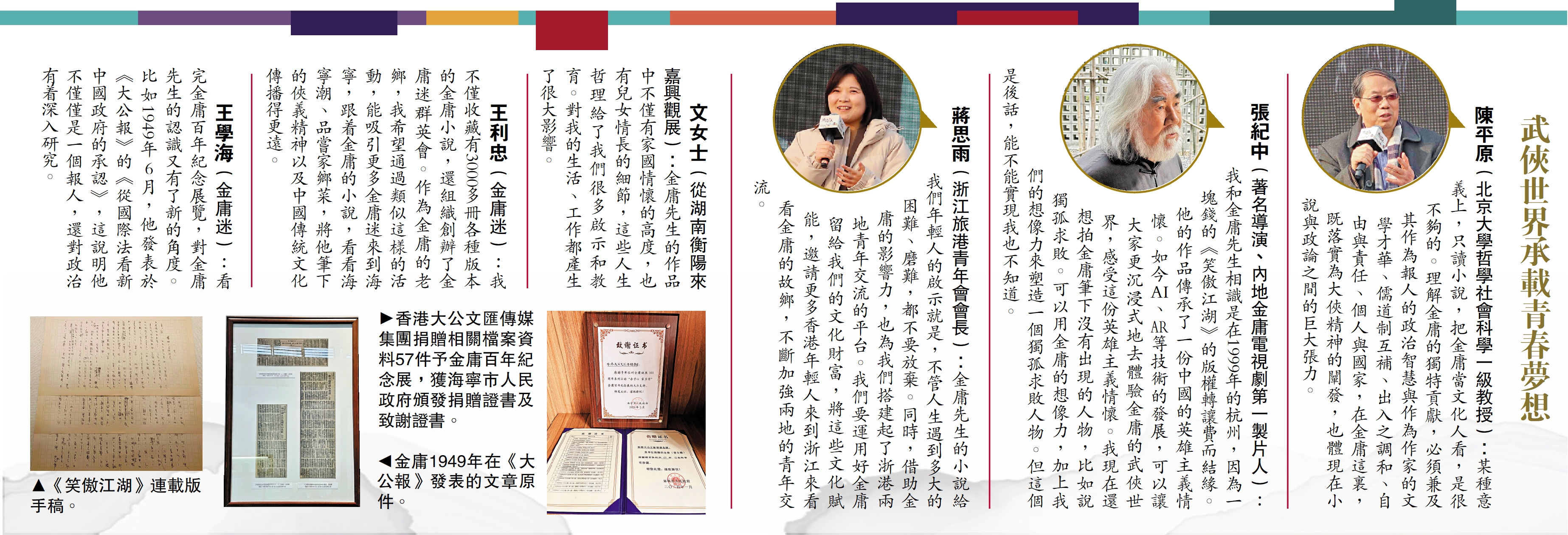蔣思雨(浙江旅港青年會會長):金庸先生的小說給我們年輕人的啟示就是,不管人生遇到多大的困難、磨難,都不要放棄。同時,借助金庸的影響力,也為我們搭建起了浙港兩地青年交流的平台。我們要運用好金庸留給我們的文化財富,將這些文化賦能,邀請更多香港年輕人來到浙江來看看金庸的故鄉,不斷加強兩地的青年交流。