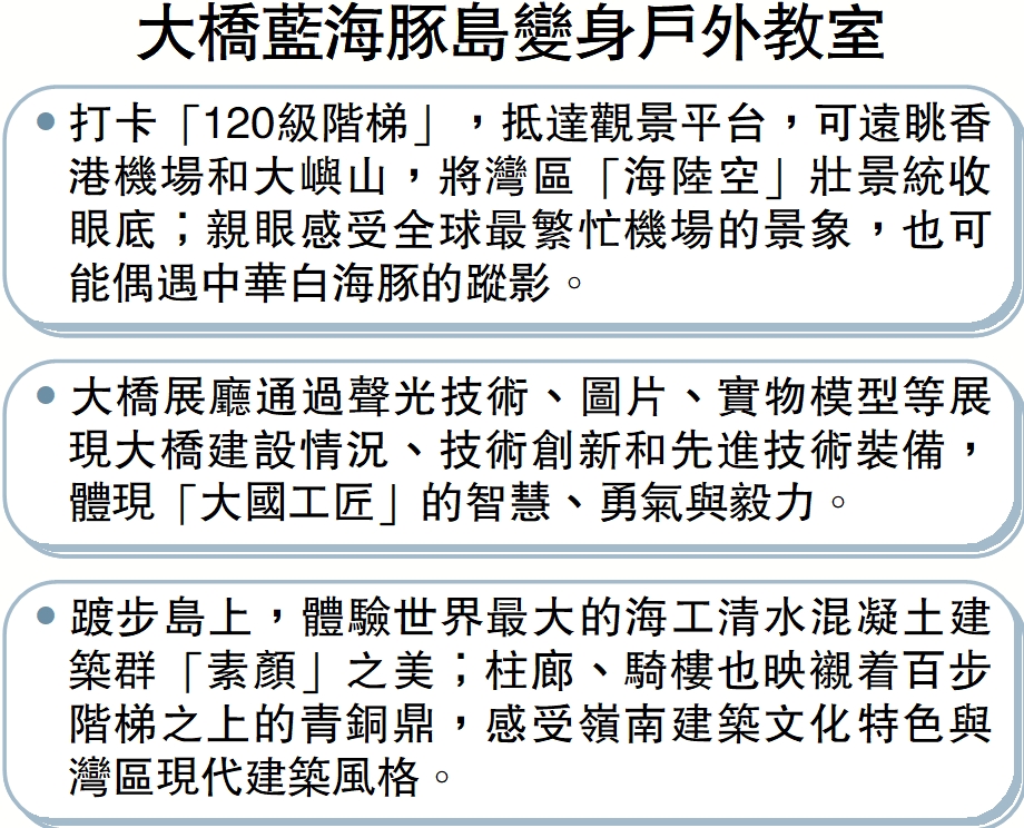 港珠澳大橋管理局副局長段國欽表示,接下來探索開展港珠澳大橋博物館、海上會客廳等服務項目,持續豐富全國愛國主義教育示範基地、全國科普教育基地和人文高地的內涵,將藍海豚島打造成為集展示體現中國夢時代精神、世界工程奇跡、伶仃洋海域風光、粵港澳三地文化為一體的大灣區知名旅遊目的地,讓遊客來了大橋不想走,走了還想來。
