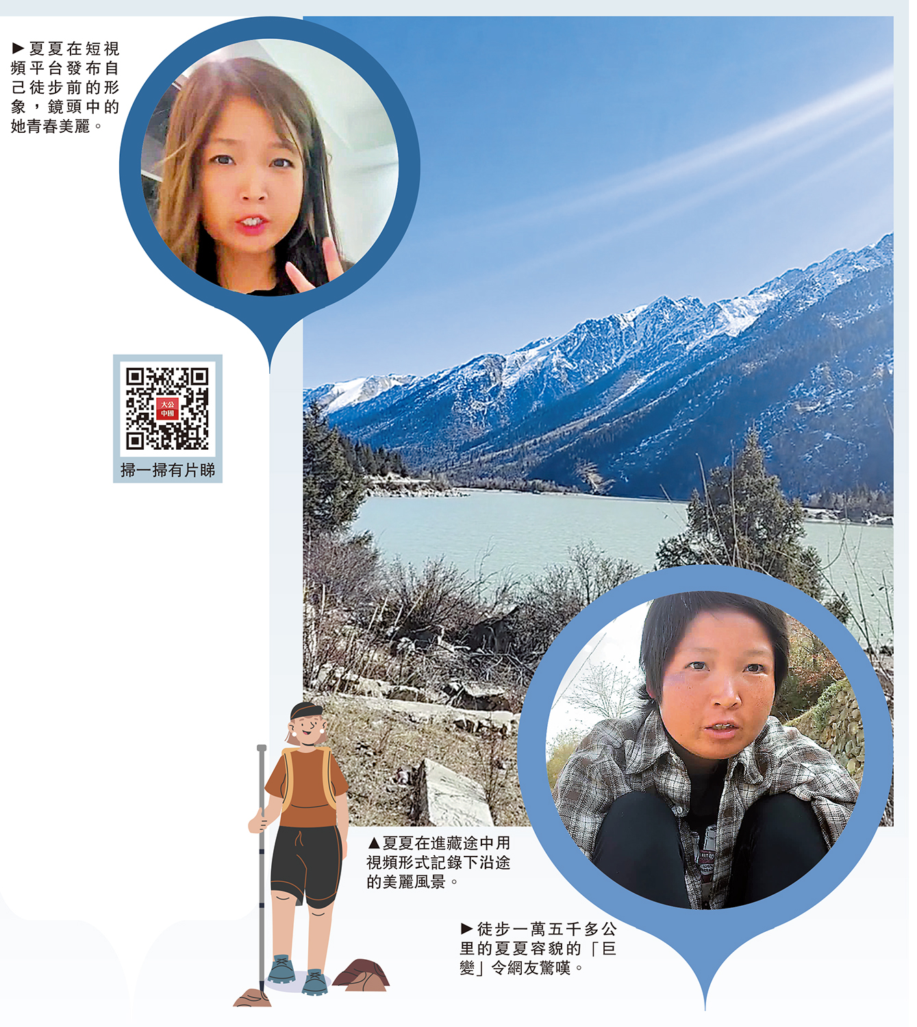 28歲,步行15000公里,兩次徒步前往西藏─近日,湖北女孩夏夏(網名)受到眾多內地網友關注,卻不是因為以上任何一個關鍵詞,而是由於她在徒步中每天日曬雨淋、常常飢腸轆轆,外貌發生巨大改變,從青春亮麗變得飽經滄桑,使得不少網友驚訝夏夏「28歲看起來像58歲大媽」。事實上,也有不少網友都驚嘆於夏夏在徒步中展現出的驚人毅力,並為她日復一日的堅持點讚。還有近十天就要到達西藏完成第二次布達拉宮之旅,夏夏接受採訪表示,「徒步」這一活動「治好了自己的精神內耗」,而她也從未在乎過自己的容貌變化,更沒有容貌焦慮,因為「身體好才是一切」。夏夏表示,下一步計劃徒步去國外。\大公報記者 張帥