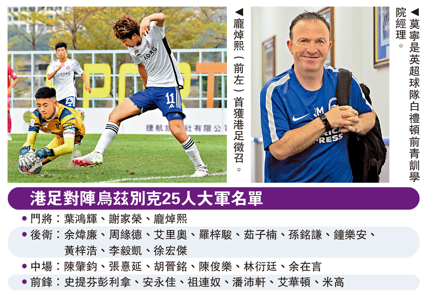 另一方面,港足在未來兩場世界盃亞洲區外圍賽對陣烏茲別克,日前已經點兵並展開操練。足總昨宣布門將伍瑋謙因傷退隊,並隨即補選兩名球員,包括晉峰門將龐焯熙及理文後衛余煒廉,令大軍名單增至25人。龐焯熙是首次獲得港足徵召。
