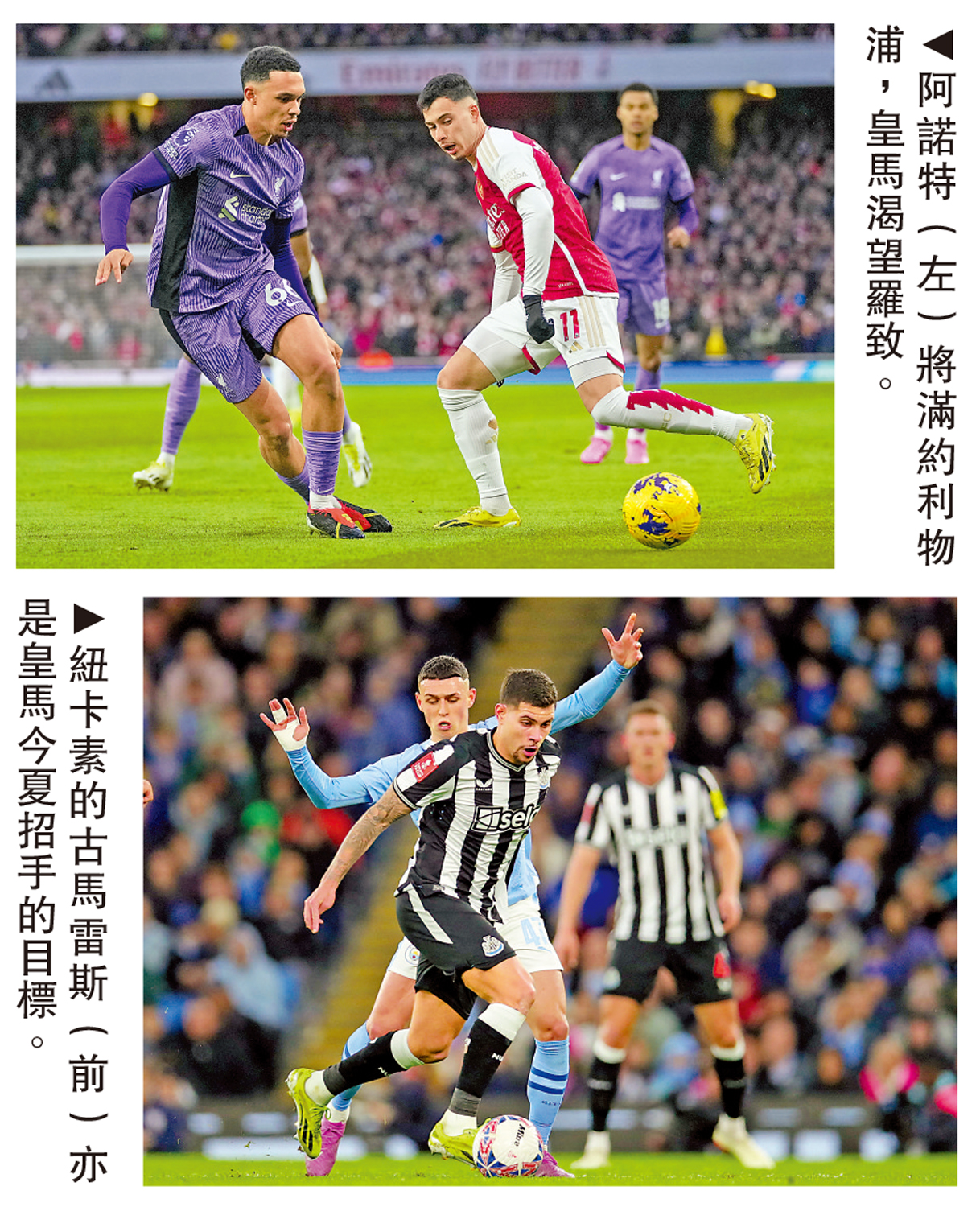 【大公報訊】據eurosport報道:皇家馬德里今夏野心不小,繼勢必簽入法國射手基利安麥巴比後,據報亦同時看上利物浦守將阿歷山大阿諾特及紐卡素中場般奴古馬雷斯,隨時又要花上一大筆金錢。