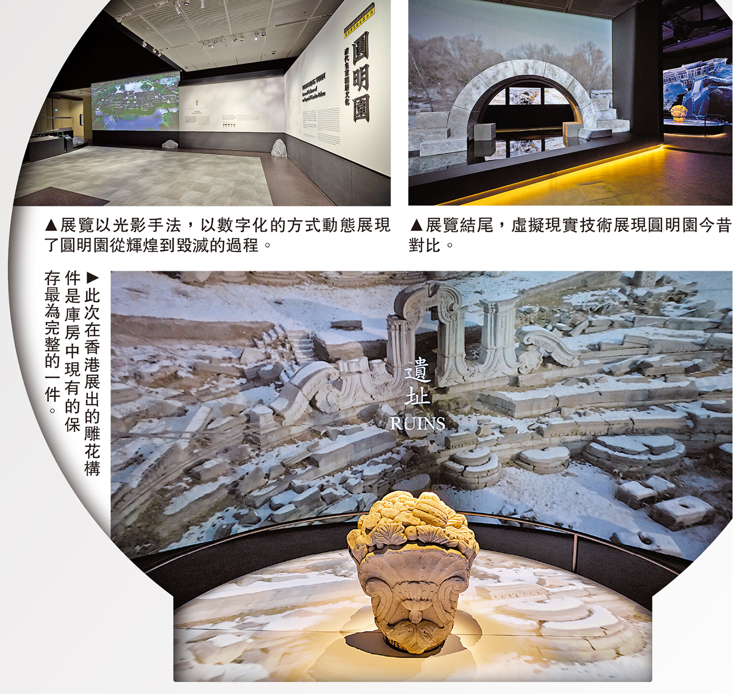 在文物的運送過程中,雙方團隊亦費了一番心思。「這個雕花構件上大下小,容易重心不穩。香港的團隊來到我們的庫房內做了詳細的測繪,採集了這個構件的三維數據並製作模型,以合適的金屬構件加固,配上藝術的光影手法,以數字化的方式動態展現了西洋樓從輝煌到毀滅的過程,才有了這樣的展覽效果。」