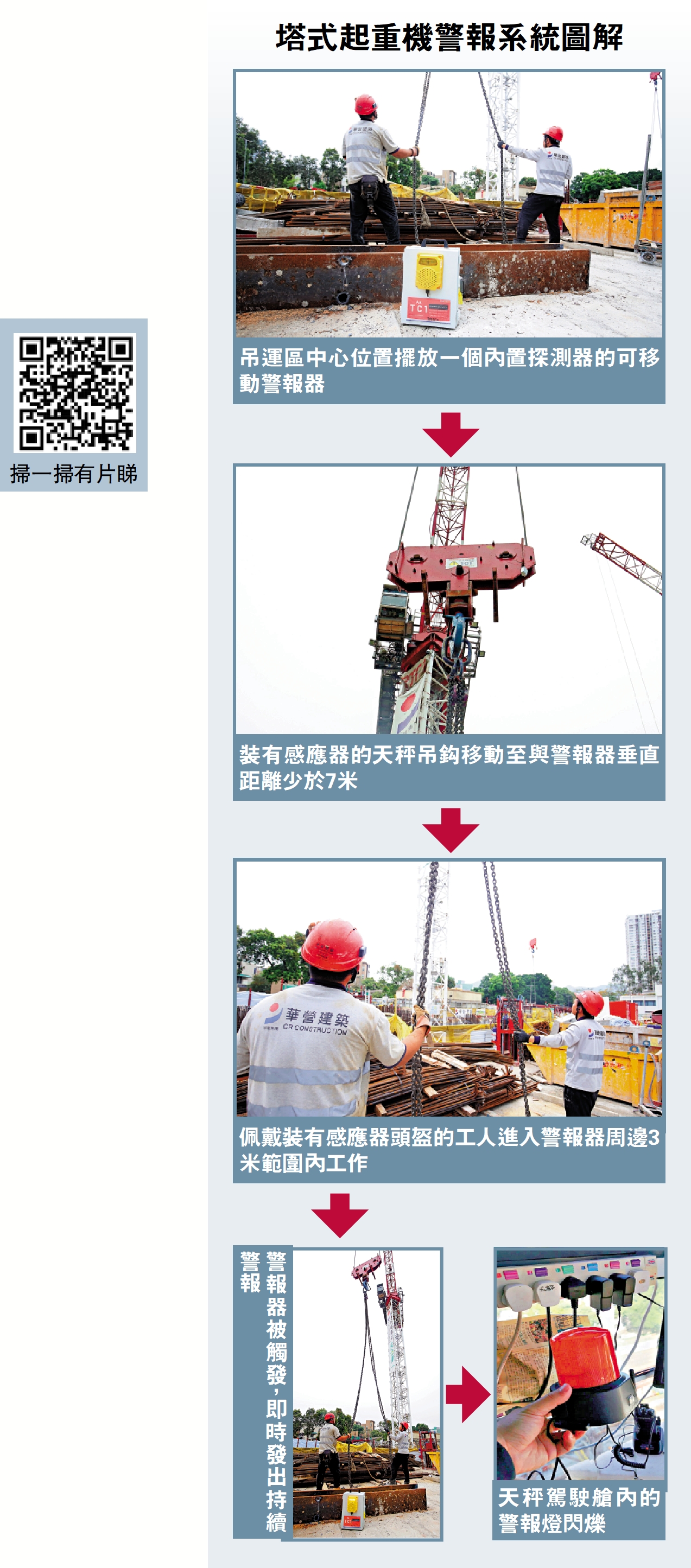 塔式起重機警報系統是在地盤的天秤吊鈎上安裝一個感應器,在吊運區中心放置一個可移動的警報器,內置探測器。吊運區域只許持有吊運牌照的工人進入,工人佩戴的紅色頭盔,裝置了感應器。當天秤的吊鈎移動至與警報器的垂直距離接近7米,而工人進入了警報器周邊3米範圍內,警報器便會發出高達100分貝的聲響,持續8秒,天秤駕駛艙內裝置的警報燈亦會閃爍。