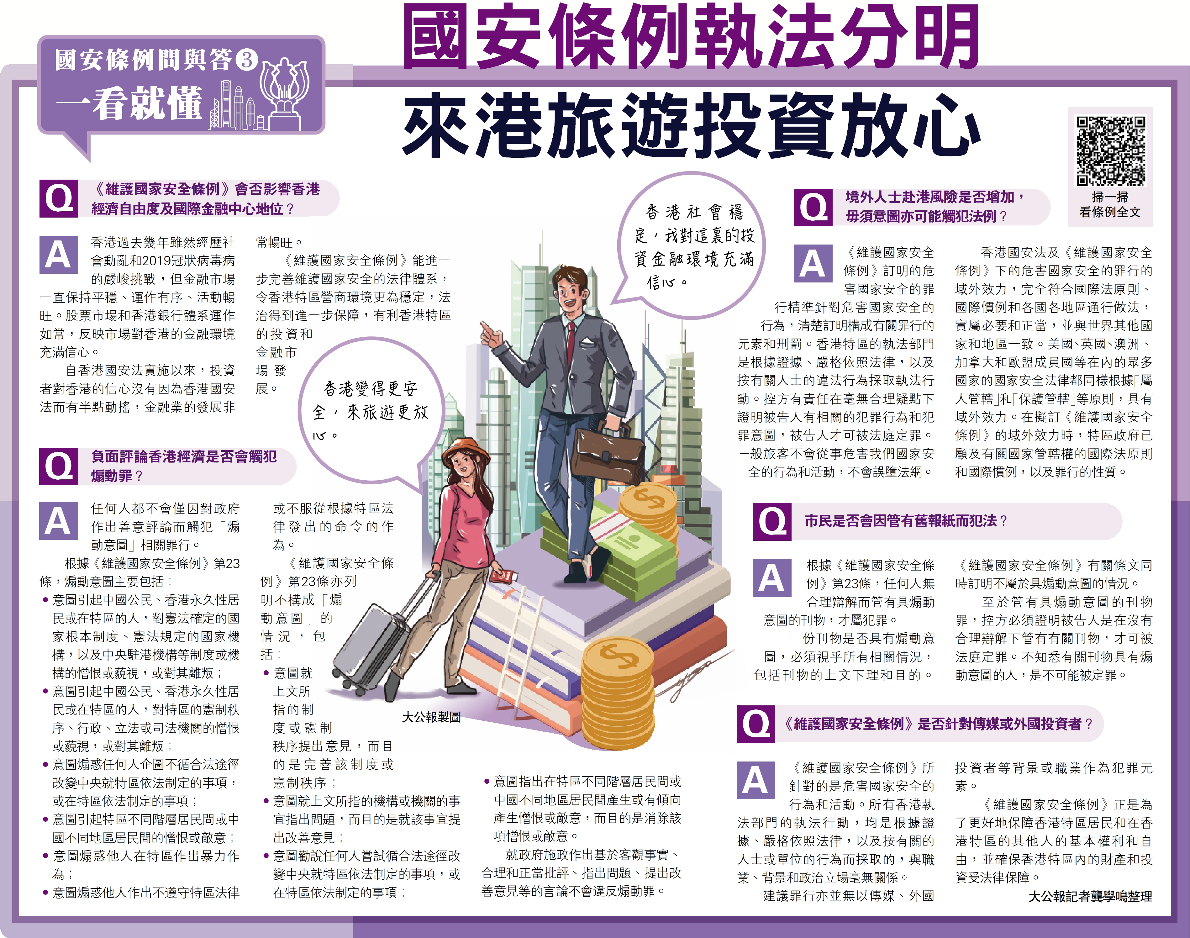 A 《維護國家安全條例》訂明的危害國家安全的罪行精準針對危害國家安全的行為,清楚訂明構成有關罪行的元素和刑罰。香港特區的執法部門是根據證據、嚴格依照法律,以及按有關人士的違法行為採取執法行動。控方有責任在毫無合理疑點下證明被告人有相關的犯罪行為和犯罪意圖,被告人才可被法庭定罪。一般旅客不會從事危害我們國家安全的行為和活動,不會誤墮法網。