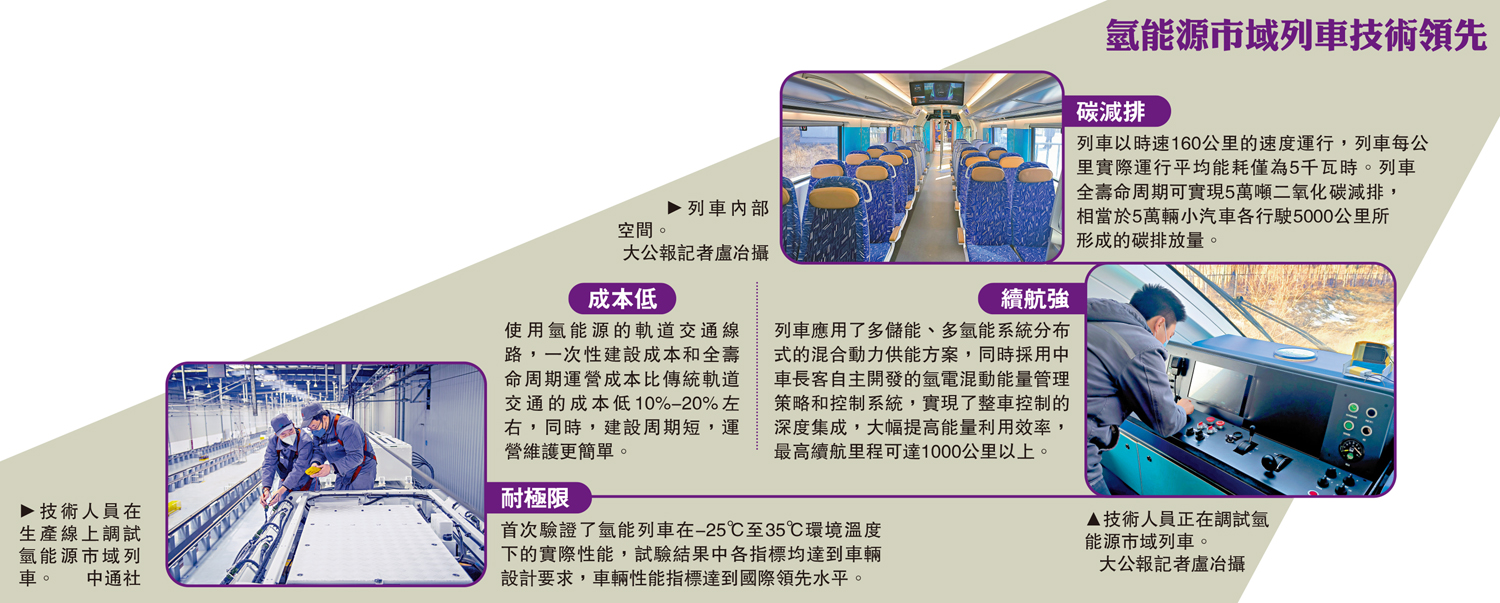 列車應用了多儲能、多氫能系統分布式的混合動力供能方案,同時採用中車長客自主開發的氫電混動能量管理策略和控制系統,實現了整車控制的深度集成,大幅提高能量利用效率,最高續航里程可達1000公里以上。