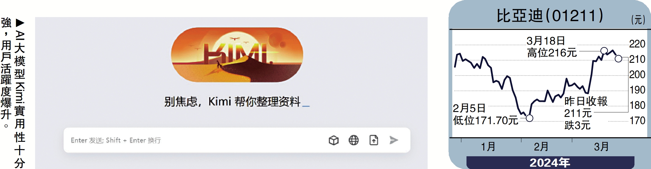 近期中國科技企業在產業創新發展、突破技術卡脖子方面有顯著成果,這與研發力度持續加大有關,去年中國仍是國際專利申請最多的來源國,為科技創新發展提供有力支持。事實上,全球AI熱潮方興未艾,推動AI大模型功能升級換代,加速AI在各行各業應用,有利新技術研發、新產業發展,中國正積極擁抱AI。事實上,國產AI大模型能力提升速度比市場預期為快。例如中國AI獨角獸企業月之暗面科技公司推出AI大模型Kimi迅速走紅,用戶活躍度爆升,主要是Kimi實用性強,可上傳、輸入200萬字長文,便可迅速得出短文總結。簡言之,Kimi可應用在專業文件、研究報告、小說作品等,從而產生高效解讀能力、資料整合能力,實用性十分強,有分析認為Kimi能力已可媲美OpenAI推出的GPT-4,可見國產大模型迅速冒起。隨着AI+策略推動下,AI技術應用日趨普及,推動國產大模型實現彎道超車,在AI生成文生圖、文生視頻等技術及功能大突破。