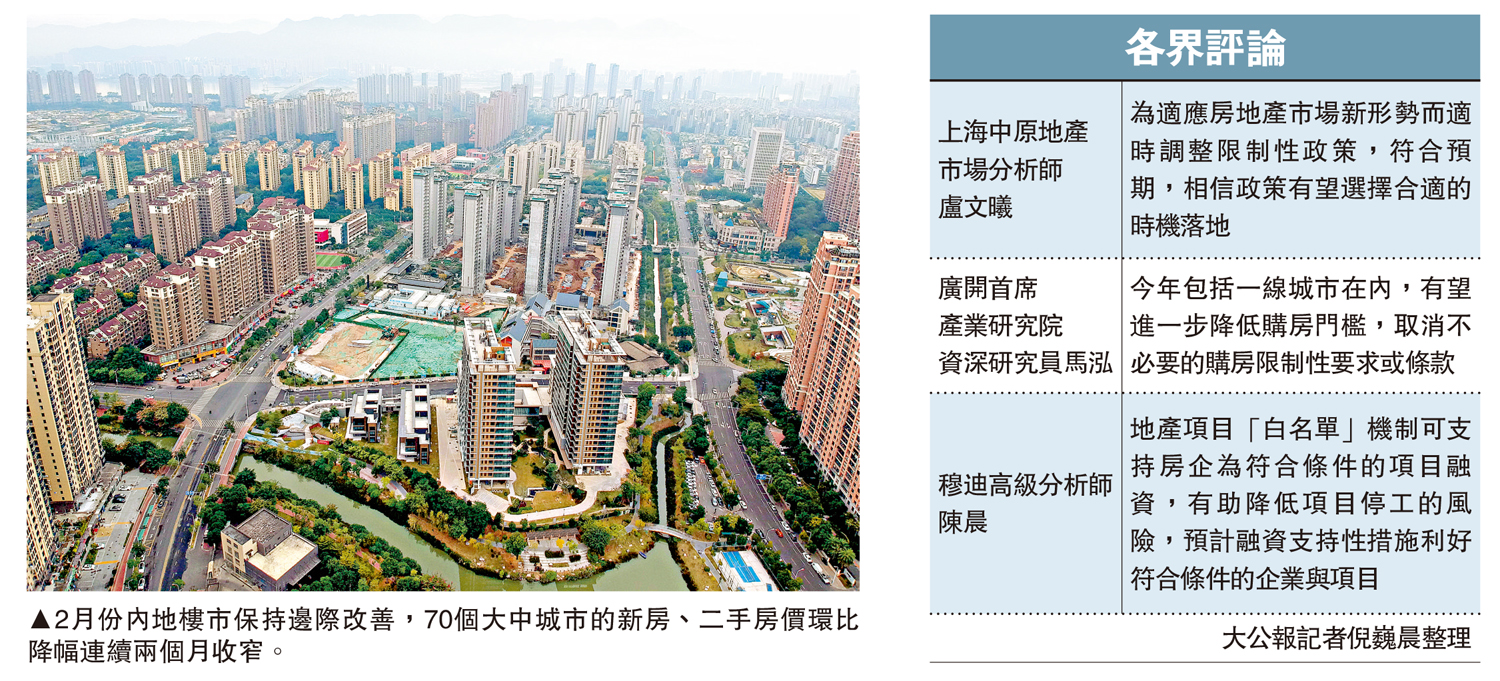 記者留意到,上月內地房地產市場保持邊際改善勢頭,70個大中城市的新房、二手房價格環比降幅均連續兩個月收窄。2月份70城新房、二手房價格平均環比跌幅分別為0.36%和0.62%,各較前值收窄0.01和0.05個百分點。