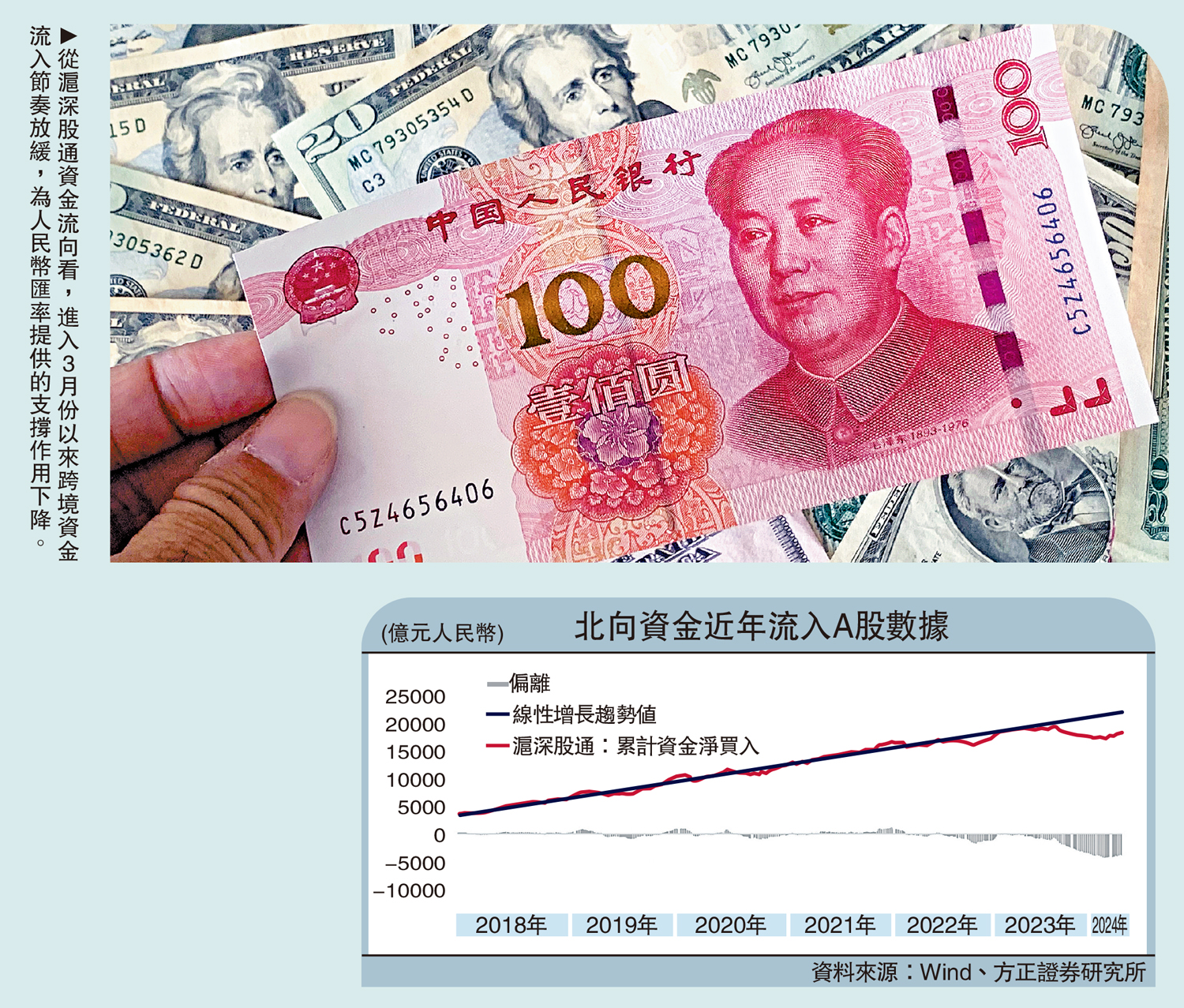 從滬深股通資金流向看,進入3月份以來跨境資金流入節奏放緩,為人民幣匯率提供的支撐作用下降,疊加美元指數重新升破104,以及匯率「維穩期」結束後即期匯率有釋放貶值壓力的衝動,即期匯率也突破2月份以來的狹窄區間。