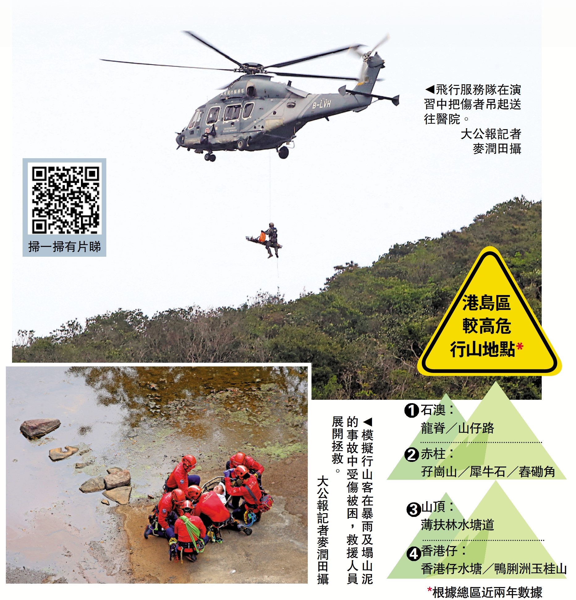 【大公報訊】記者古倬勳報道:警方昨日(27日)聯同消防處、政府飛行服務隊、民安隊等跨部門進行重大事故演習,模擬大型救援及山嶺搜救行動,並透過無人機及HKSOS手機應用程式協助搜索,加強警方及各持份者的協作、預防及應變能力。