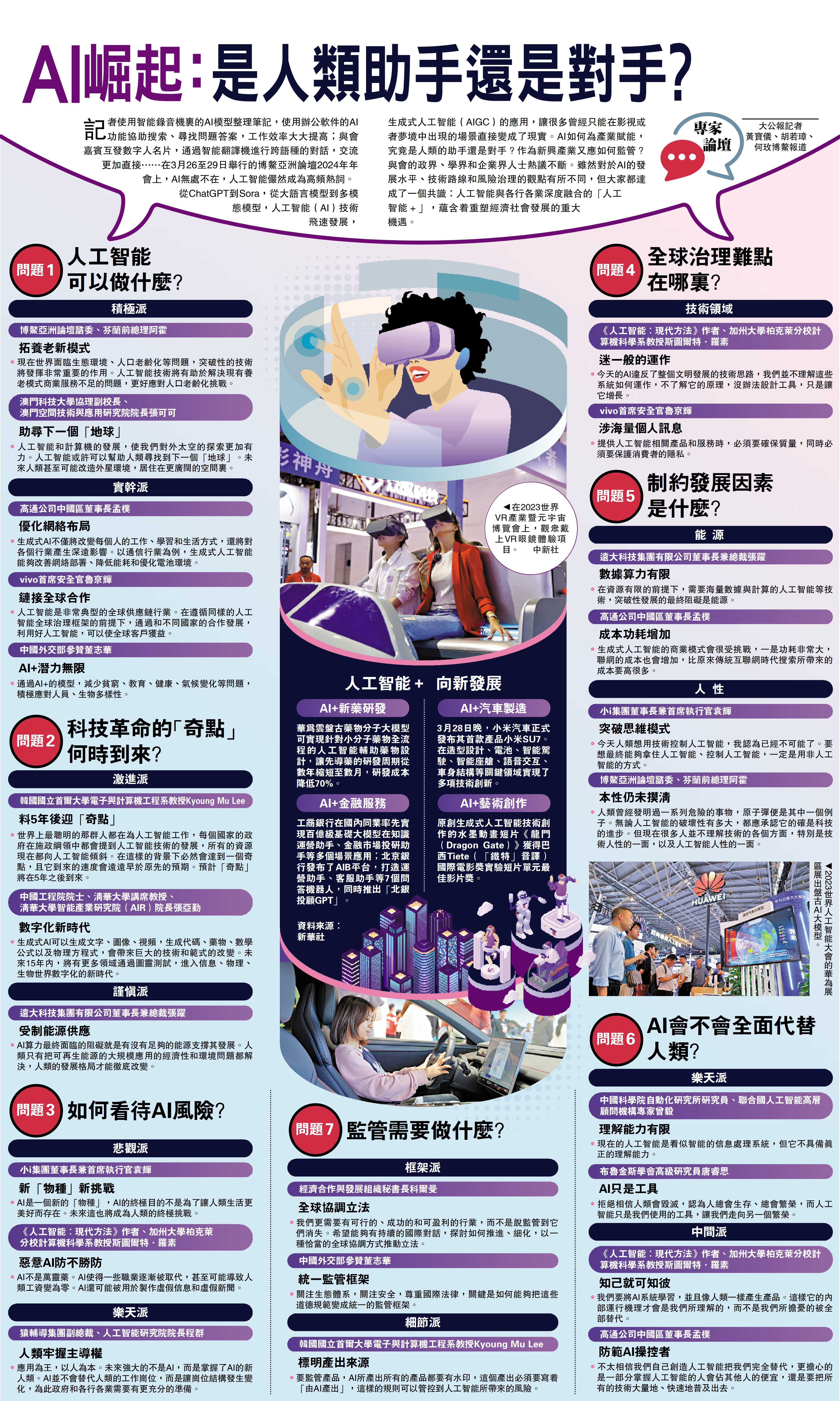 從ChatGPT到Sora,從大語言模型到多模態模型,人工智能(AI)技術飛速發展,生成式人工智能(AIGC)的應用,讓很多曾經只能在影視或者夢境中出現的場景直接變成了現實。AI如何為產業賦能,究竟是人類的助手還是對手?作為新興產業又應如何監管?與會的政界、學界和企業界人士熱議不斷。雖然對於AI的發展水平、技術路線和風險治理的觀點有所不同,但大家都達成了一個共識:人工智能與各行各業深度融合的「人工智能+」,蘊含着重塑經濟社會發展的重大機遇。