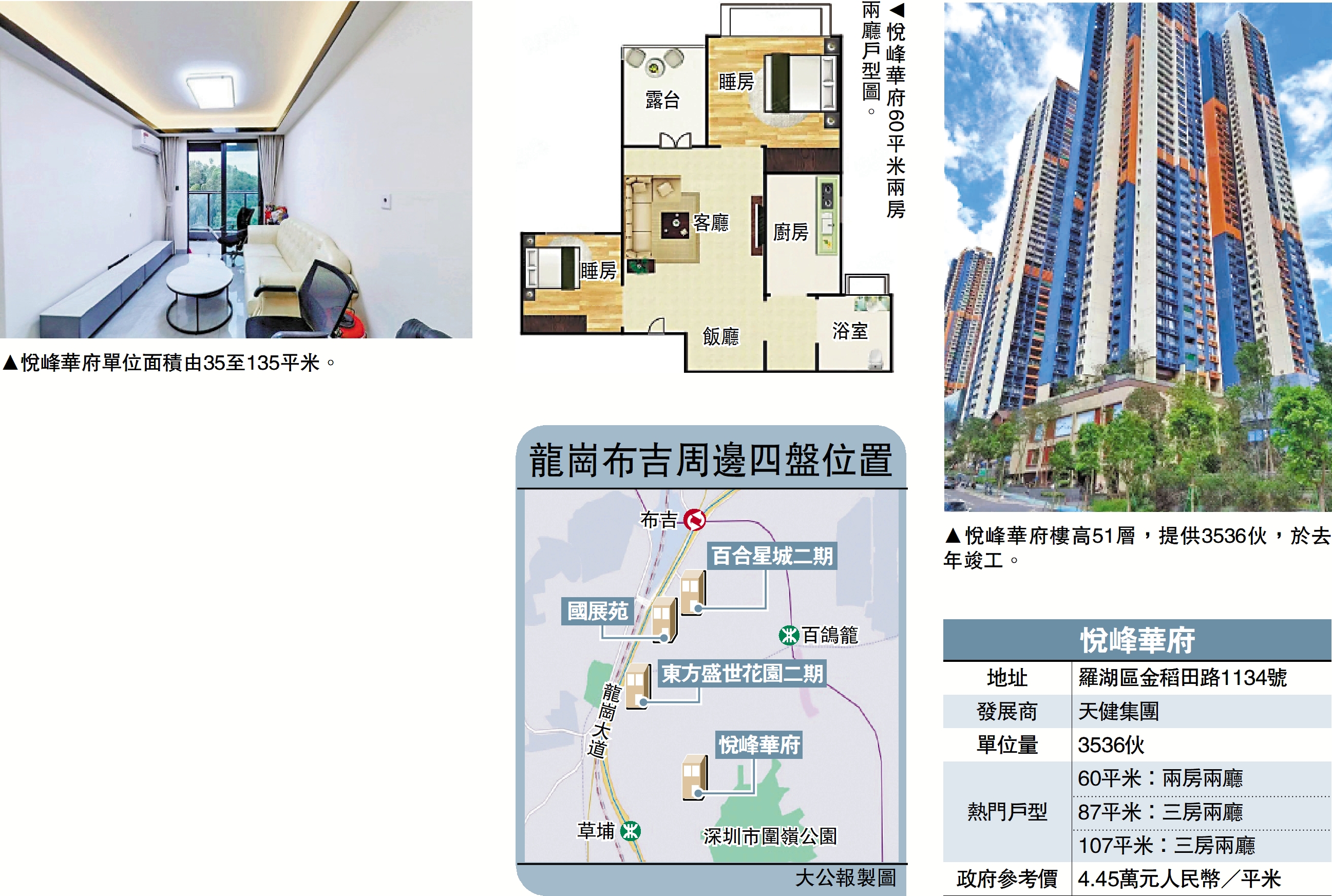 深圳市龍崗區布吉街道緊鄰羅湖,交通便利,有地鐵3號、5號和14號線交匯的布吉站,並與深圳東站融為一體,通過地鐵約15分鐘可達羅湖口岸。龍崗區持續推進布吉新城建設,並推動將其納入全區產業空間格局,明確作為龍崗「西核」萬億級電子信息承載區的發展目標。布吉街道是深圳樓價窪地,一直是港人置業的後花園。位於布吉關附近的悅峰華府,兩房單位售228萬元(人民幣,下同,約247萬港元),價格具吸引力。\大公報記者 李昌鴻深圳報道