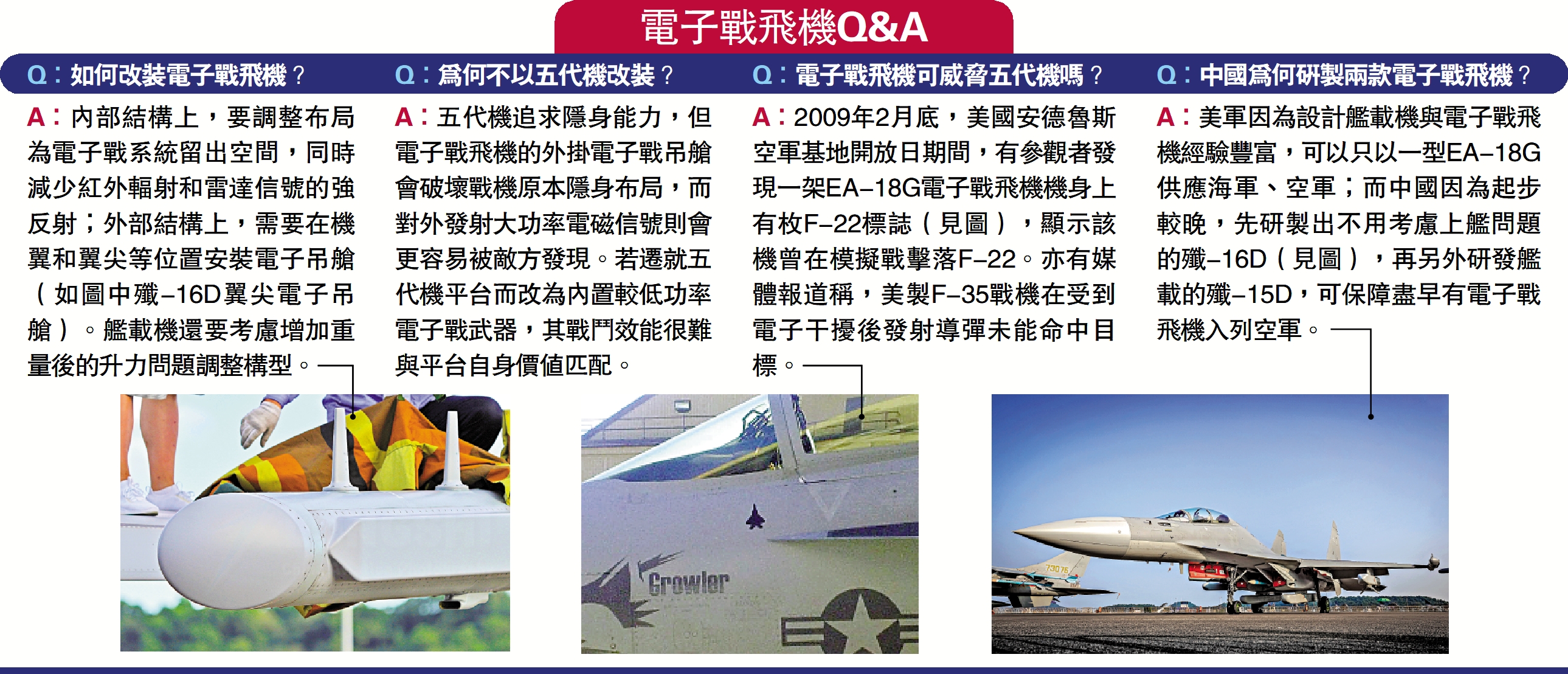 A:美軍因為設計艦載機與電子戰飛機經驗豐富,可以只以一型EA-18G供應海軍、空軍;而中國因為起步較晚,先研製出不用考慮上艦問題的殲-16D(見圖),再另外研發艦載的殲-15D,可保障盡早有電子戰飛機入列空軍。